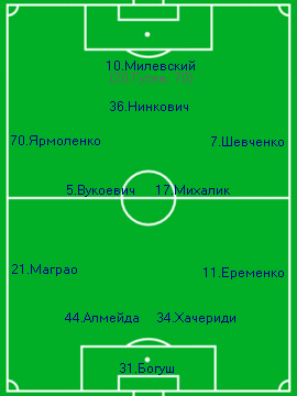 «Динамо»: 31.Богуш, 5.Вукоевич, 7.Шевченко, 10.Милевский(К) (20.Гусев, 70), 11.Еременко, 17.Михалик, 21.Маграо, 34.Хачериди, 36.Нинкович, 44.Алмейда, 70.Ярмоленко.