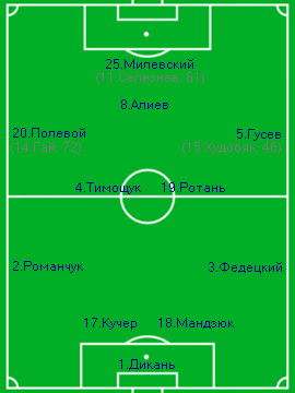 Украина: 1.Дикань, 17.Кучер, 18.Мандзюк, 3.Федецкий, 2.Романчук, 4.Тимощук(К), 19.Ротань, 20.Полевой (14.Гай, 72), 5.Гусев (15.Худобяк, 46), 8.Алиев, 25.Милевский (11.Селезнев, 61).