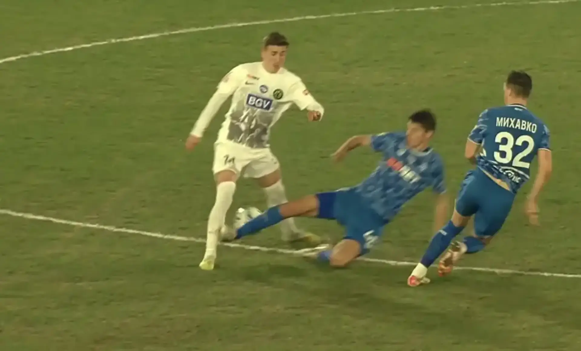 — епізоду на 49-й хвилині першого тайму з грубою грою високо піднятою ногою гравця „Динамо“ (Київ) Крістіана Біловара, що створювала ризик нанесення травми гравцю „Полісся“ Ліндону Емерллаху.