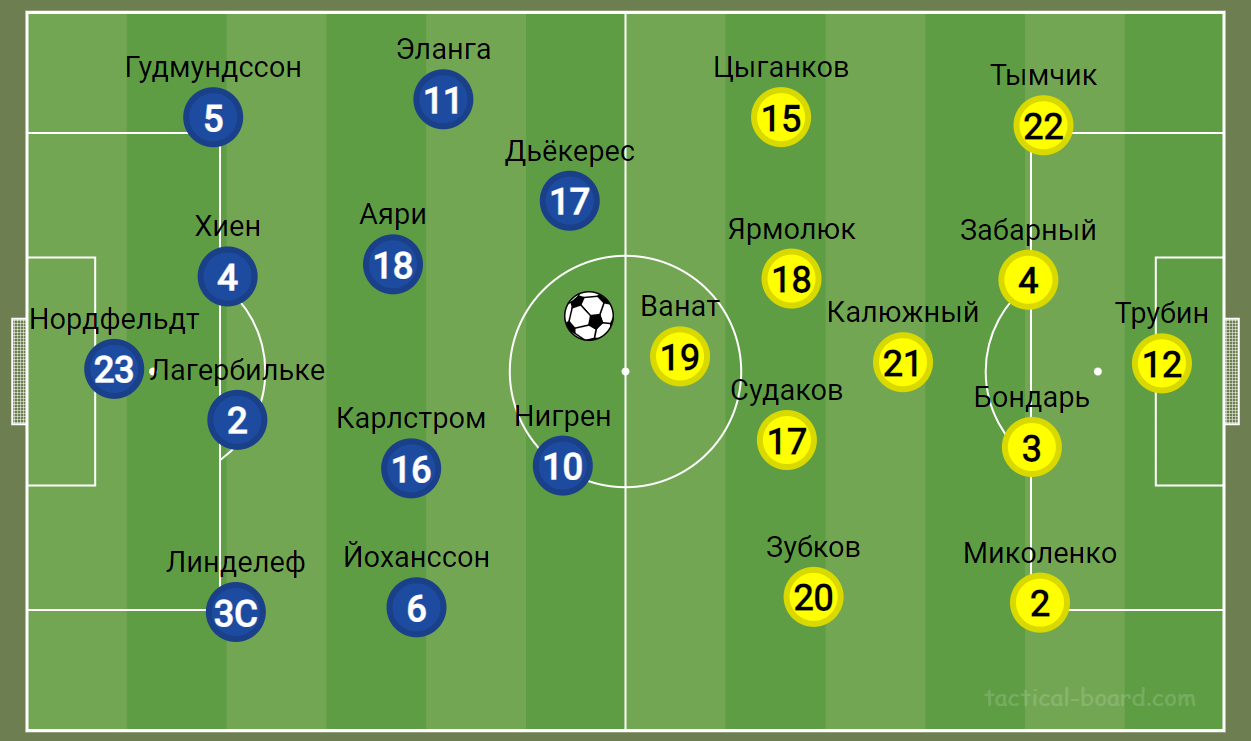 Сборная Швеции: 23.Нордфельдт, 2.Лагербильке, 4.Хиен, 3.Линделеф (К), 5.Гудмундссон, 6.Йоханссон, 18.Аяри, 16.Карльстрем, 10.Нюгрен, 11.Эланга, 17.Дьекереш.