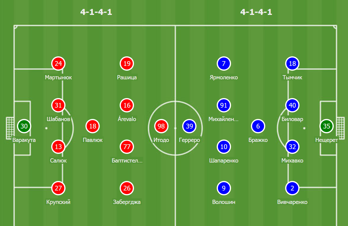 «Динамо»: 35.Нещерет — 18.Тымчик, 40.Биловар, 32.Михавко, 2.Вивчаренко — 6.Бражко, 91.Михайленко, 10.Шапаренко — 7.Ярмоленко (К), 9.Волошин — 39.Герреро.