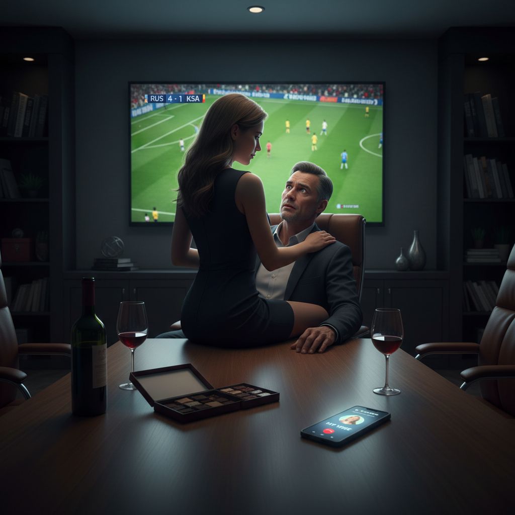 В офисе уже никого не было... У нас стоят две "плазмы" - одна в витрине, выходящей на улицу (там постоянно крутятся ролики с предложениями по домам), другая плазма висит у меня в кабинете. Вот, туда я и пригласил клиентшу. Принес еще вина, конфет, заварил кофе. Извинился, попросил разрешение включить телек без звука: включил комп, перевел трансляцию с витрины на кабинет, нашел сопку с матчем и включил...