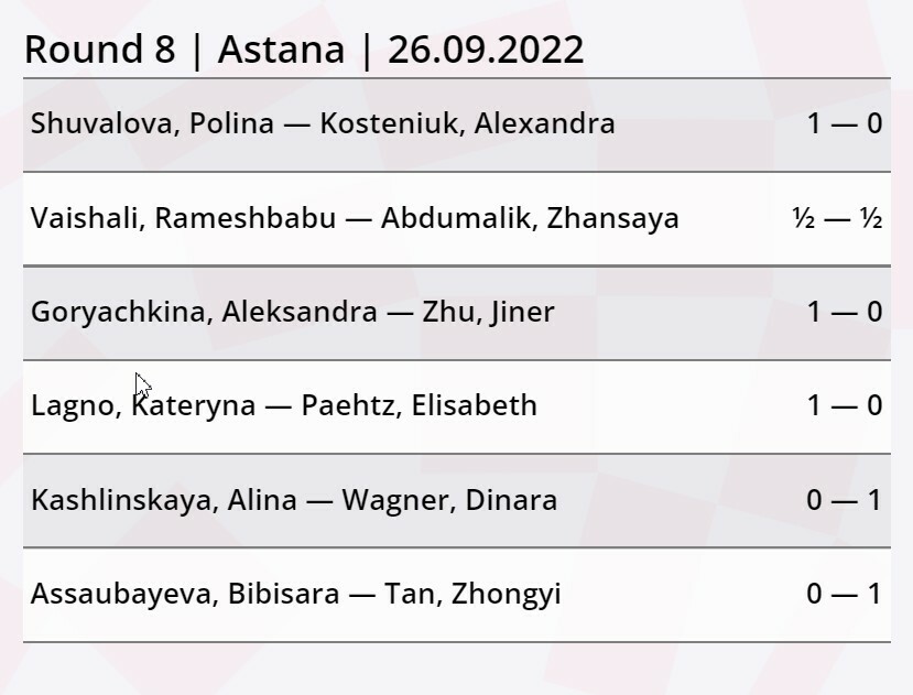 Результаты 8 тура. Шувалова - Костенюк 1-0, Горячкина - Чжу Цзиньэр 1-0, Лагно - Петц 1-0, Кашлинская - Вагнер 0-1, Асаубаева - Тань Чжунъи 0-1, Вайшали - Абдумалик ничья