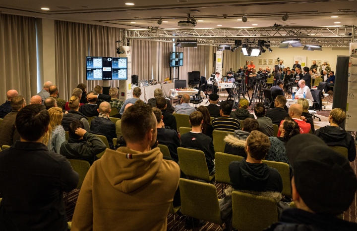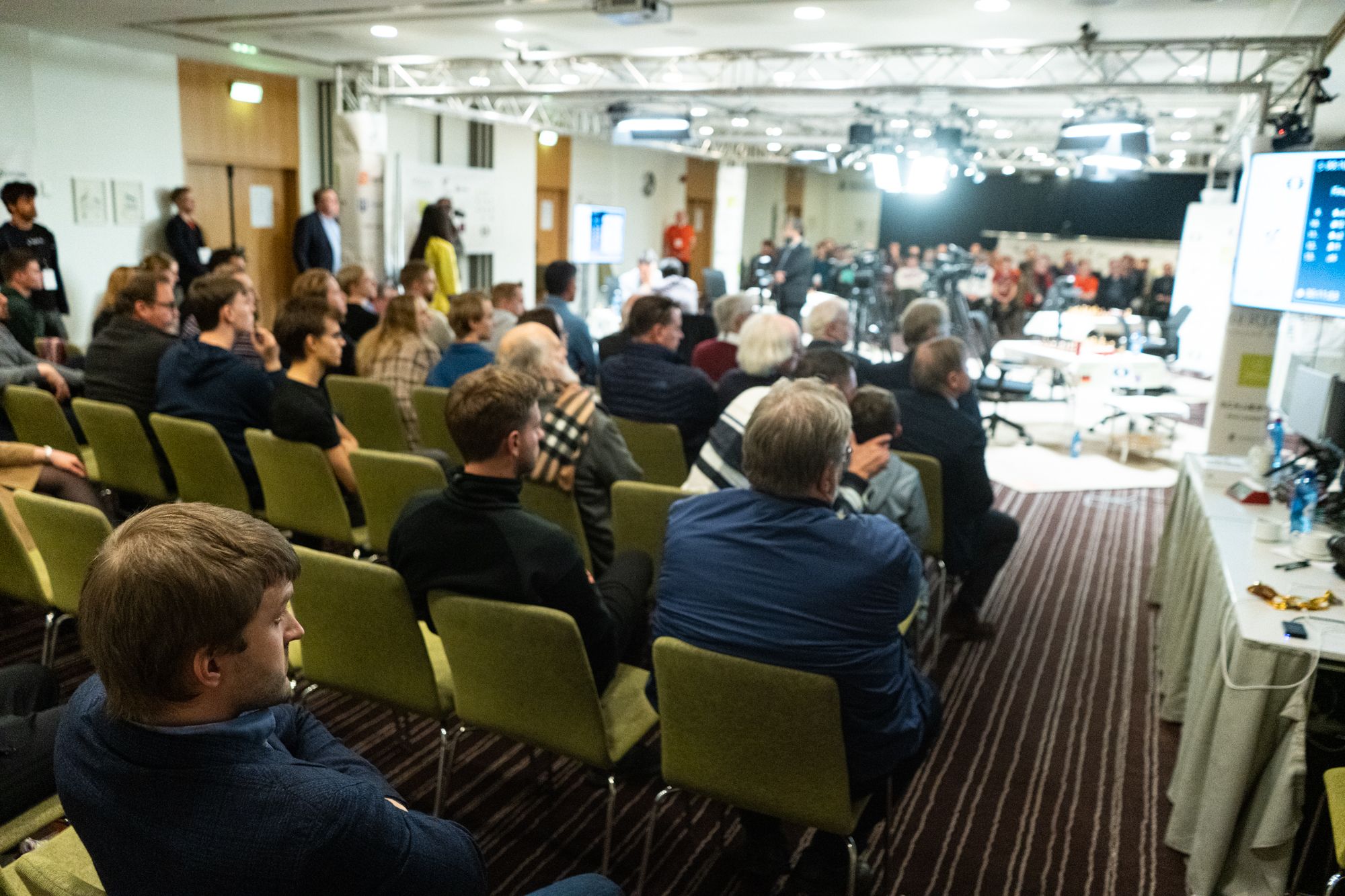 Вид из зрительного зала. В левом нижнем углу - секундант Непомнящего Никита Витюгов. Фотография Марии Емельяновой/Chess.com