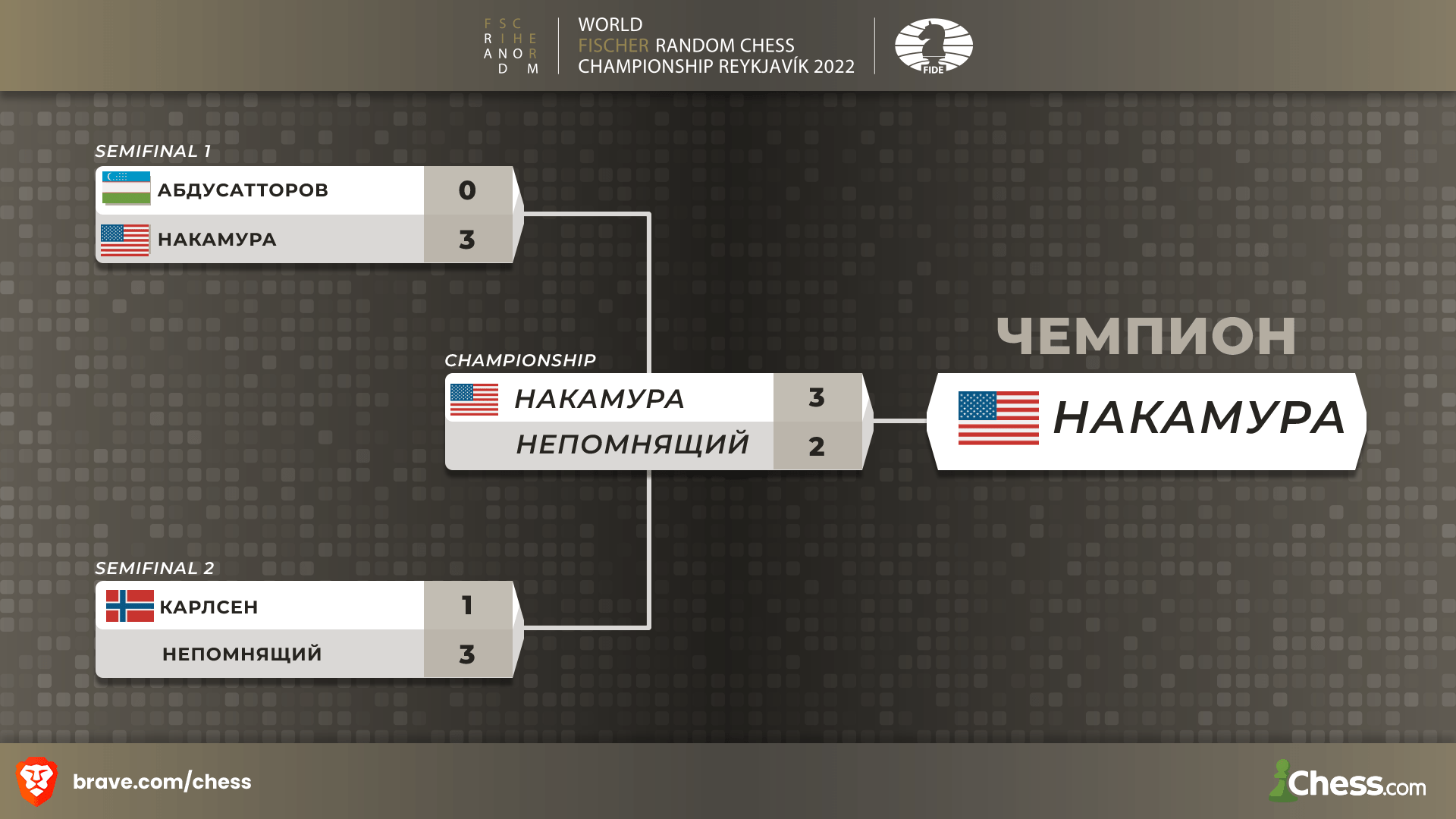 1/2. Накамура - Абдусатторов 3-0; Непомнящий - Карлсен 3-1 Финал. Непомнящий - Накамура 2-2 (0:1)