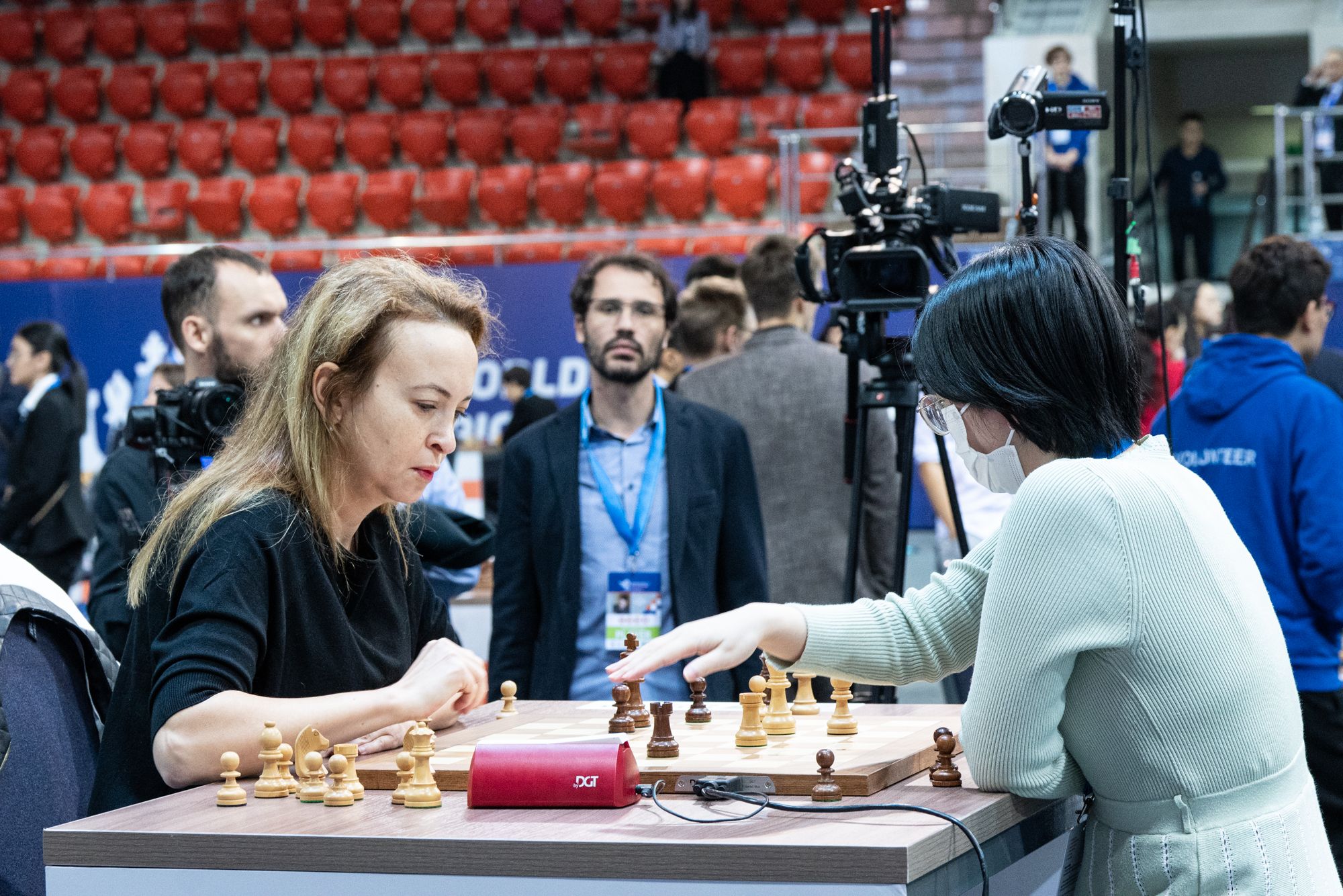 Kosteniuk (right) struggled to stay consistent in the tournament but still managed to ruin the dreams of several highly-seeded players. Photo: Maria Emelianova/Chess.com.