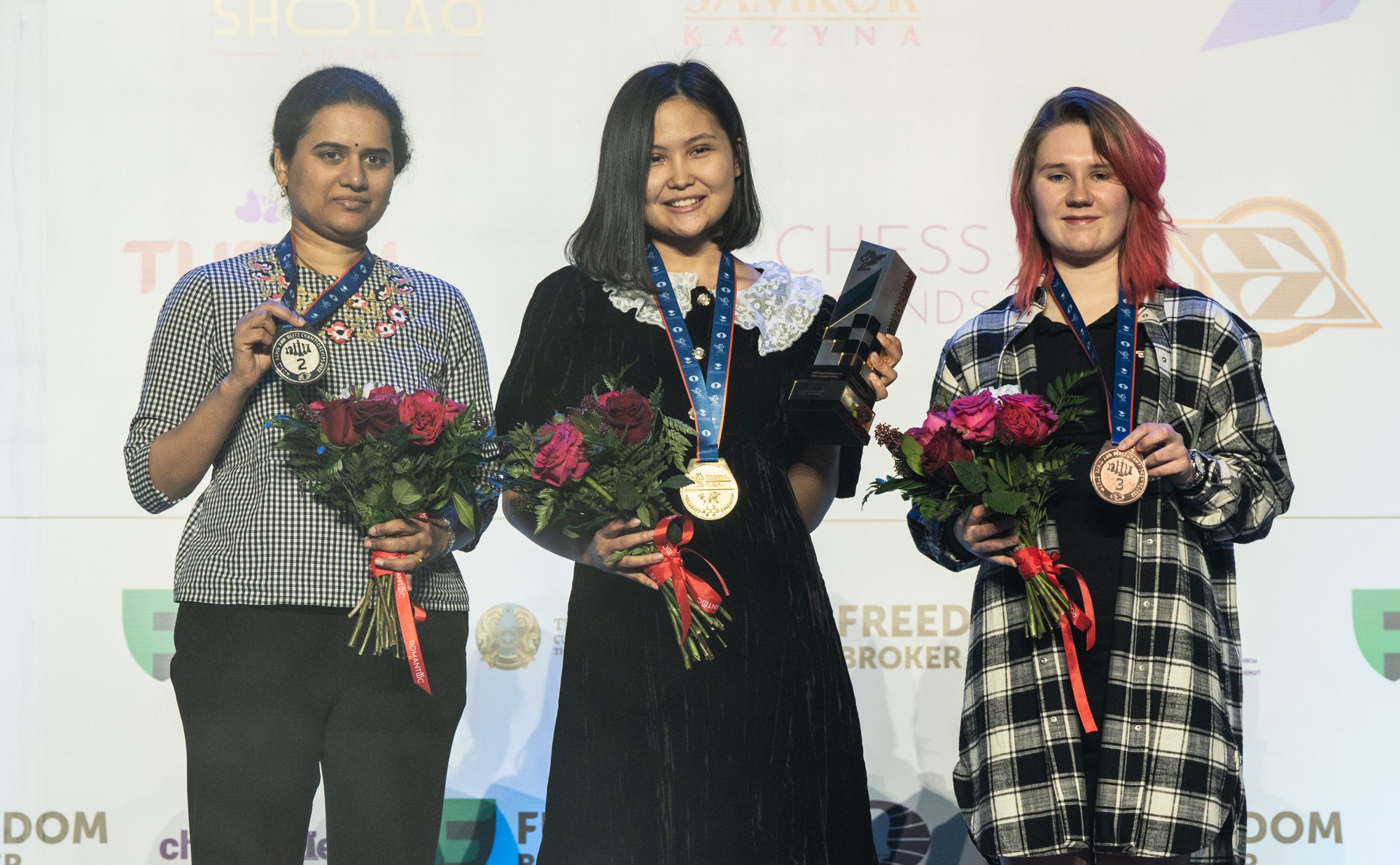 Assaubayeva, Koneru, and Shuvalova on the podium. Photo: Maria Emelianova/Chess.com.