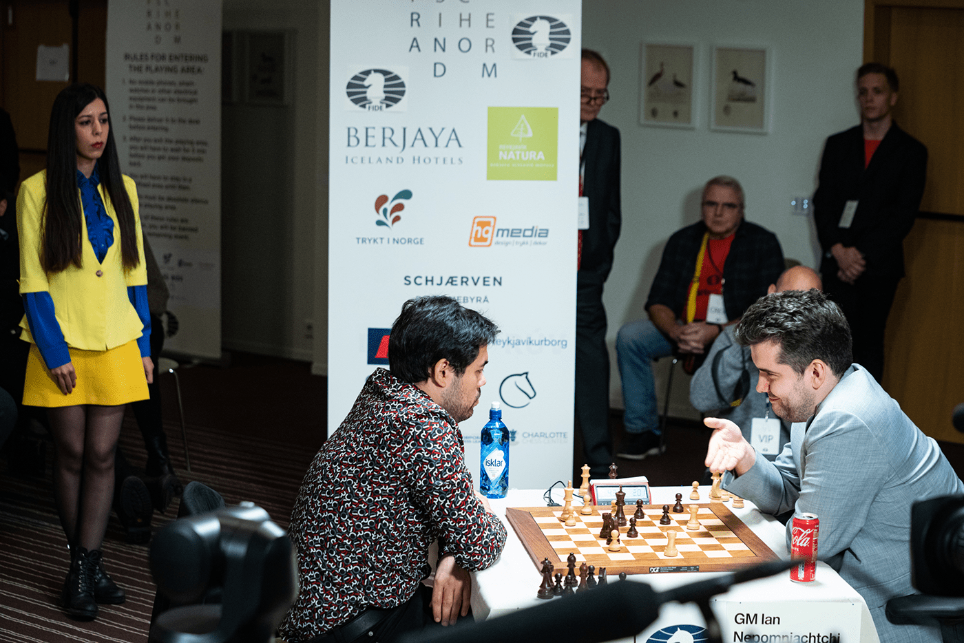 Хикару Накамура и Ян Непомнящий на чемпионате мира по шахматам Фишера, Шохрех Байят слева. Фотография Марии Емельяновой/Chess.com.