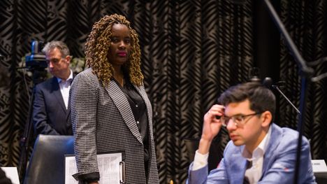 Интервью Абдусатторова после партии. Round 2. Фотография Леннарта Утса/WR Chess Masters.