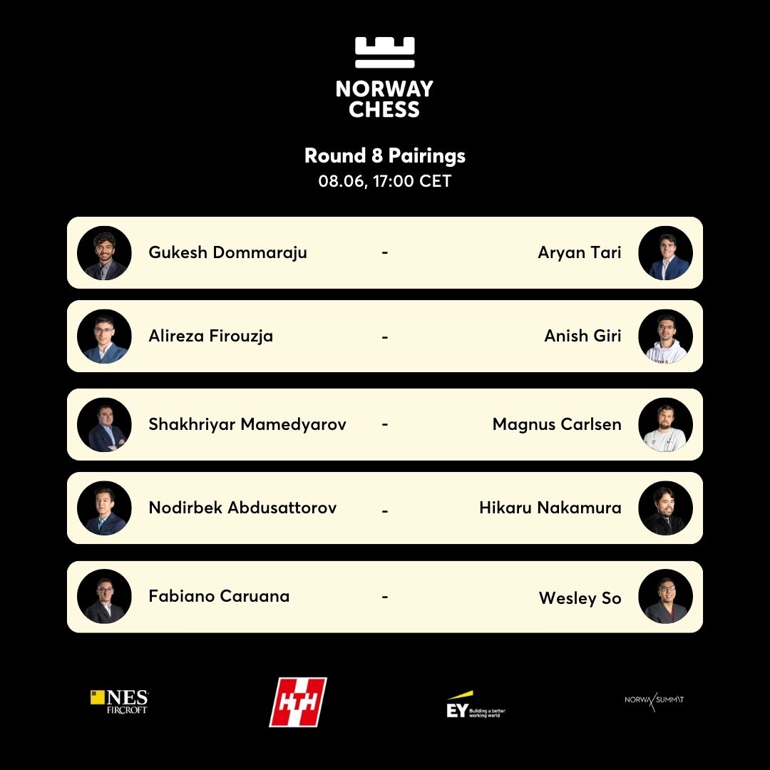 Пары 9 тура. Со - Гукеш, Накамура - Каруана, Карлсен - Абдусатторов, Гири - Мамедьяров, Тари - Фирузджа