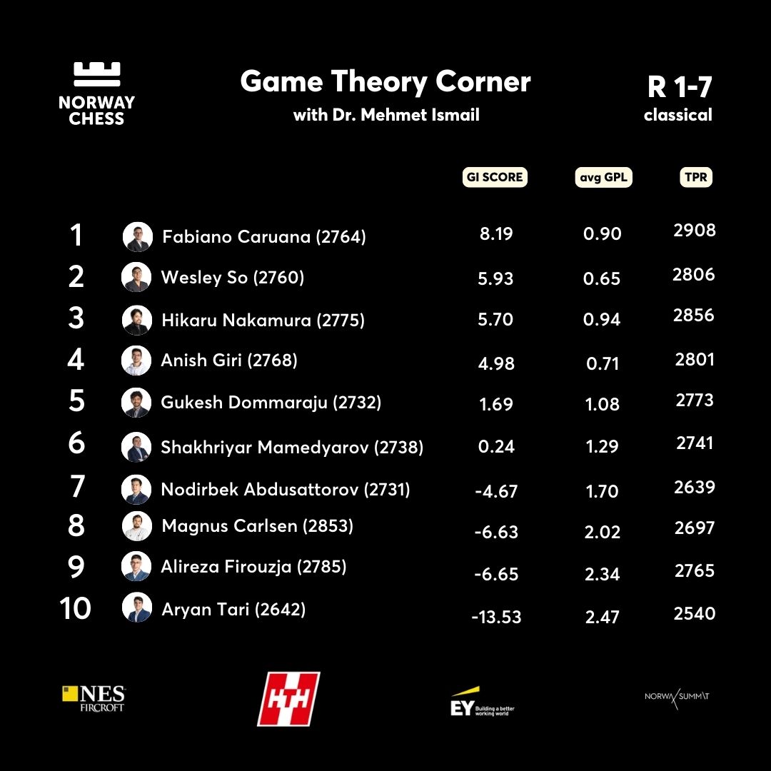 Положение после 8 туров. 1. Каруана - 16; 2. Накамура - 13.5; 3. Гукеш - 13; 4-5. Со, Гири - 11.5; 6-7. Карлсен, Фирузджа - по 10.5; 8. Мамедьяров - 10; 9. Абдусатторов - 7.5; 10. Тари - 3