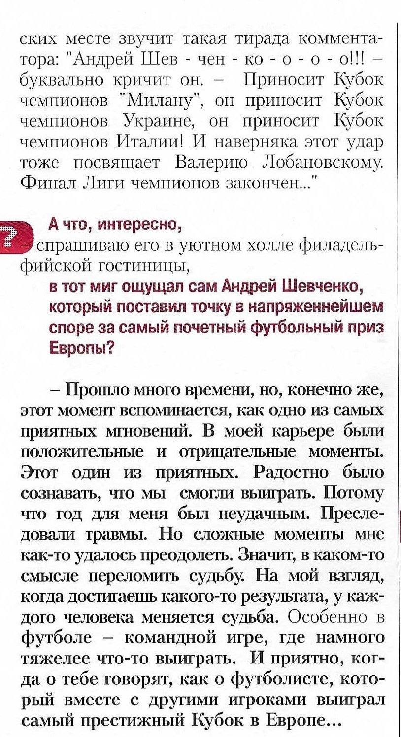 Для молодых болельщиков напомню, что Андрей Шевченко стал третьим из украинцев, после Олега Блохина (1975) и Игоря Беланова (1986), обладателем "Золотого мяча".
