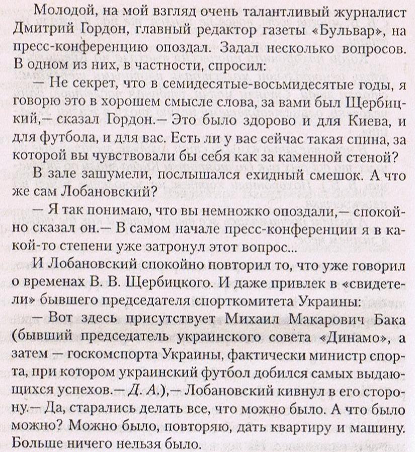 В тот день Лобановский привёл пример одной из публикаций о команде в довольно солидной газете, где, с его точки зрения, было «все искажено». Речь шла о том периоде, когда первым человеком в Украине был В. В. Щербицкий,, который так любил команду, что для неё, якобы, «все делалось». На этом моменте главный тренер киевского «Динамо» остановился довольно подробно. Посетовал, что подобные публикации порождают различные кривотолки, плодят дополнительные вопросы. Рассказал как было в действительности «в период Щербицкого».