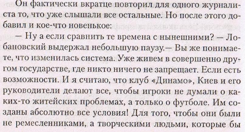 — Да ничего не делали вообще! — воскликнул Лобановский.— Кроме квартиры и машины. Больше не было ничего. А получали, если вы хотите, я вам могу сказать оклад — 160 рублей. Ну, 160 долларов. Сейчас говорят, что рубль раньше — это был доллар. Причем у всех одинаковые оклады... Нельзя было Блохину сделать 250, а игроку, который играет во втором составе,— 130. Нет.