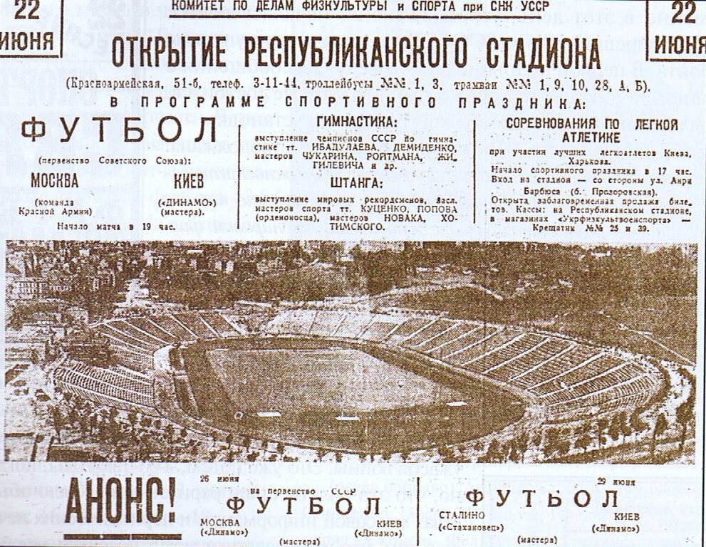 Сегодня воскресенье, 22-го июня с.г., с горечью пишу о том, что в тот летний день, 84 года тому назад, болельщики киевского «Динамо» жили в предвкушении праздника открытия полностью реконструированного Республиканского стадиона.