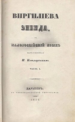 Котляревський І.П.— автор «Енеїди» (1798 рік, у трьох частинах; 1842 року — повне посмертне видання, підготовлене особисто І.Котляревським) — першого твору нової української літератури, написаного народною мовою.