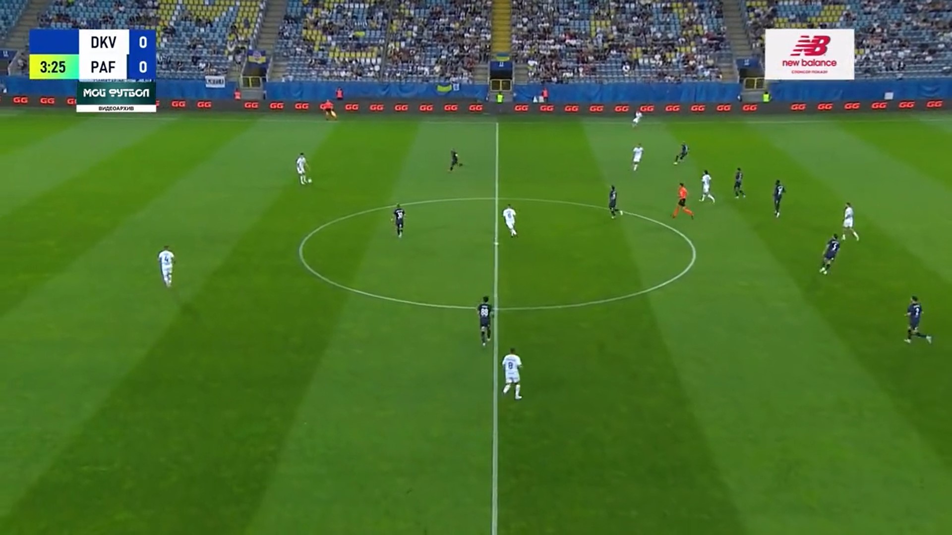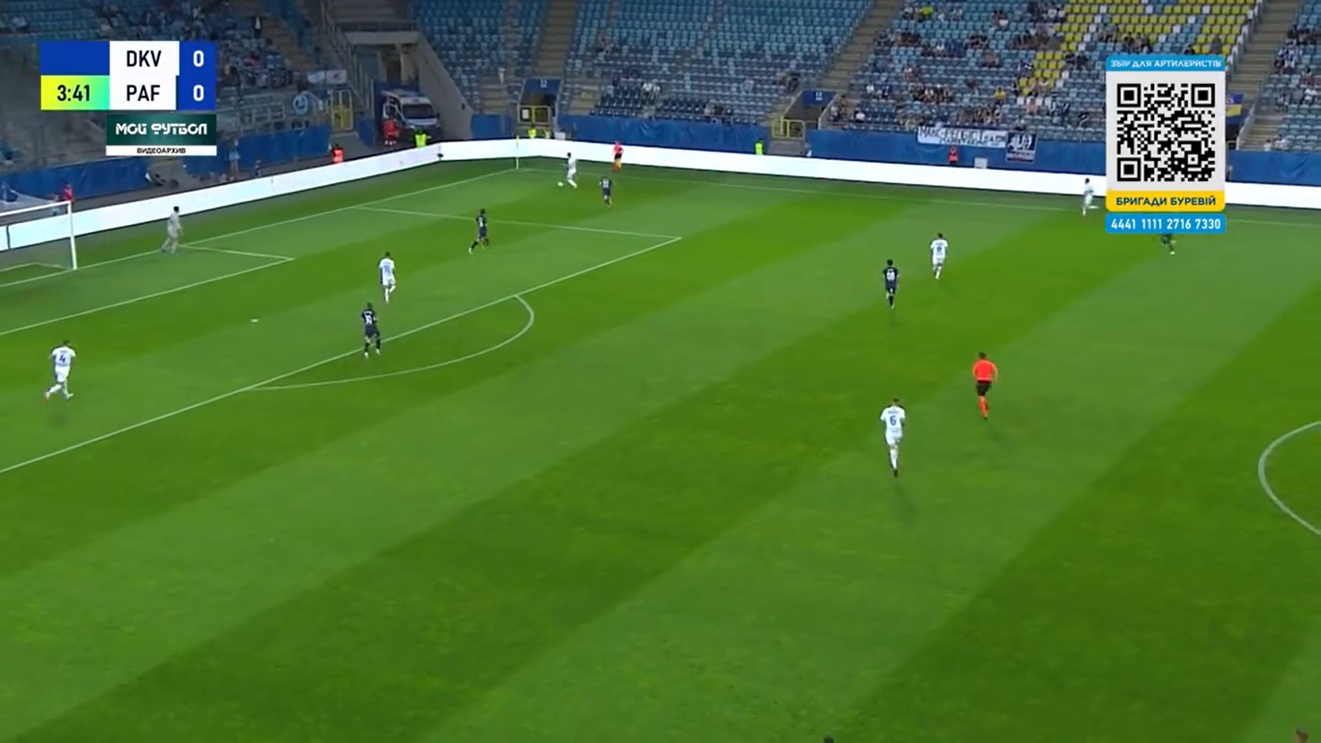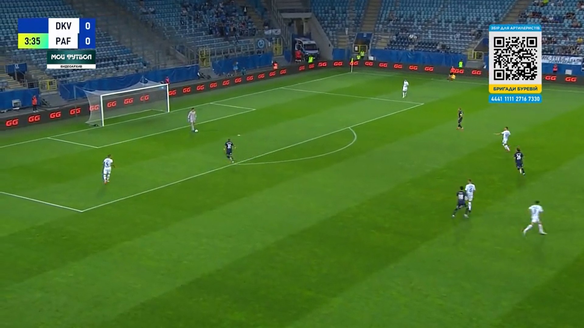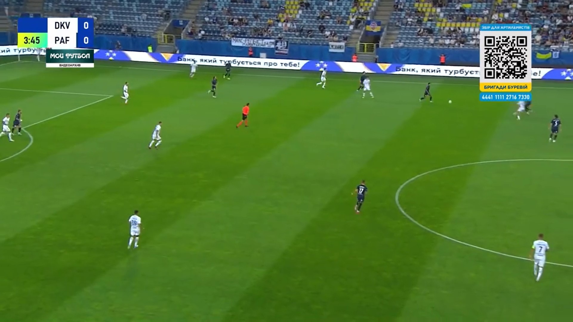 Фото 5. Бражко і Піхальонок відтягуються на свою половину поля. Вже 4 суперника на нашій половині. Дубінчак в глибокому тилу противника. Тимчика не видно, але припускаю, що десь на рівні Дубінчака чекає передачі. Попов відає передачу Піхальонку. Піхальонок приймає м’яча обличчям до своїх воріт. Його вже підтискає кіпріот.