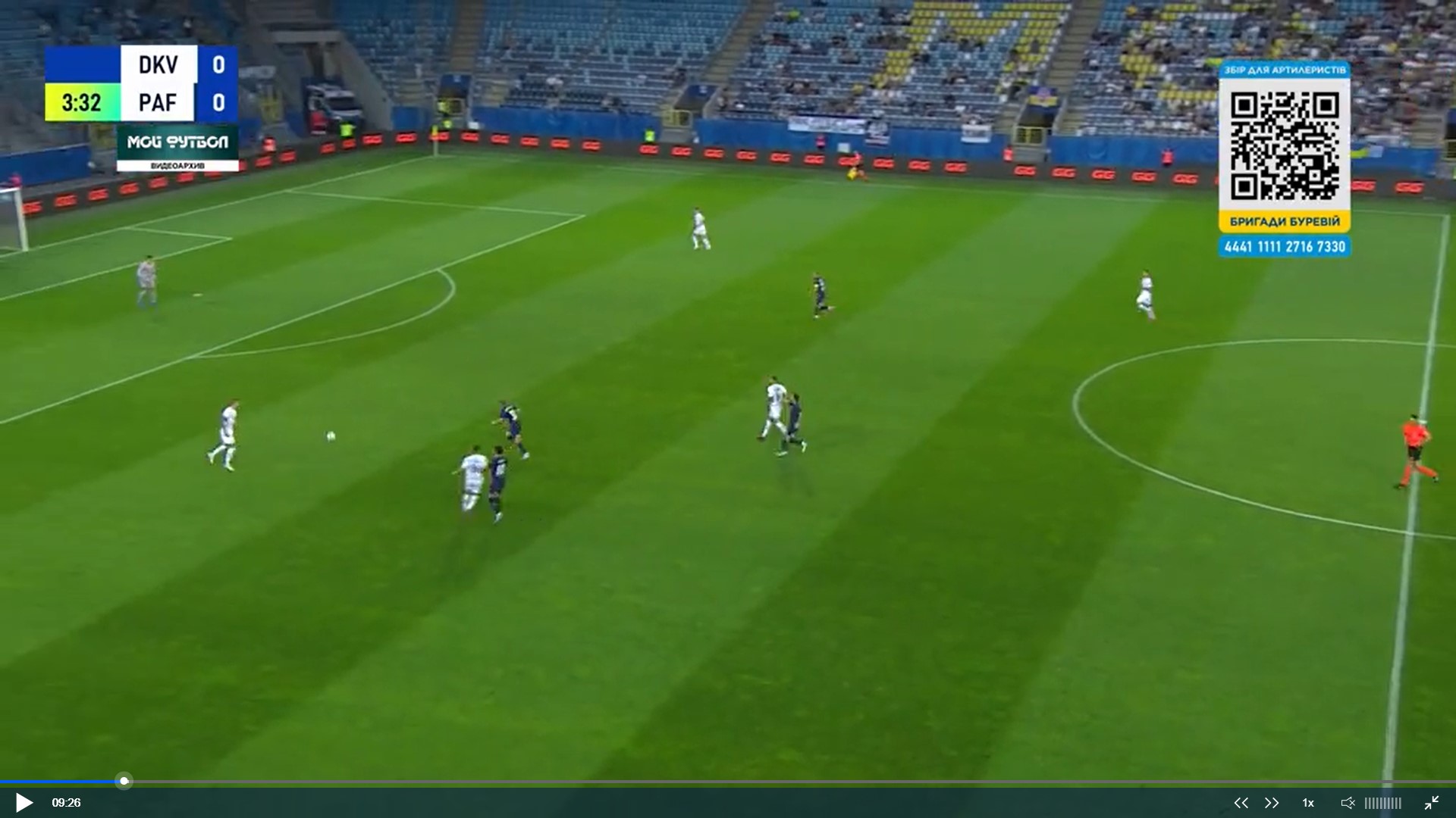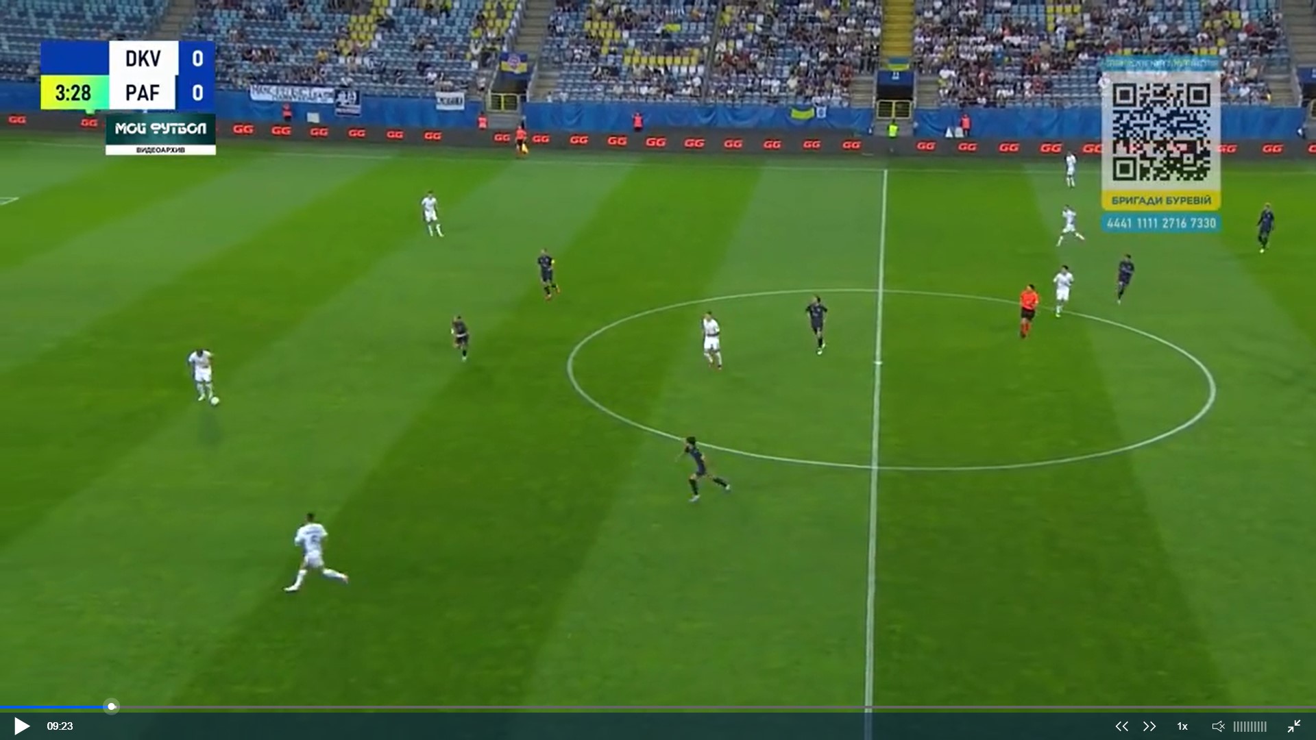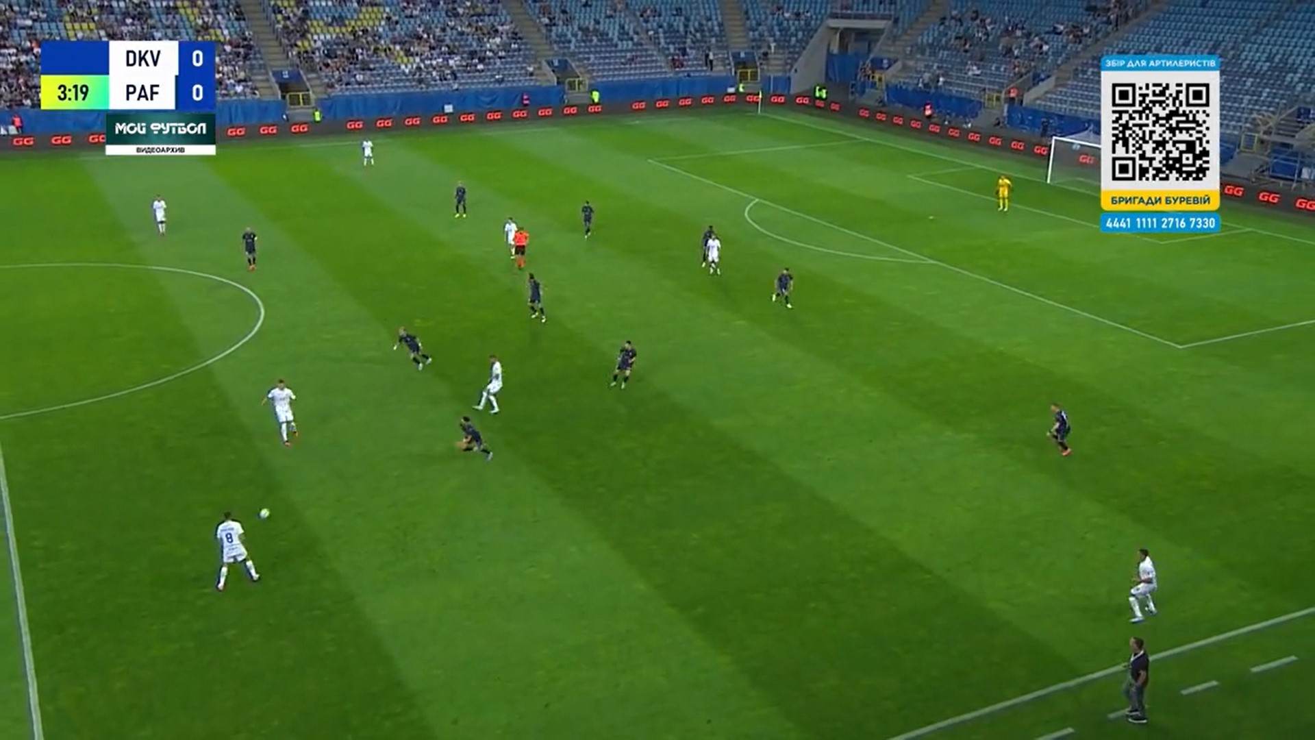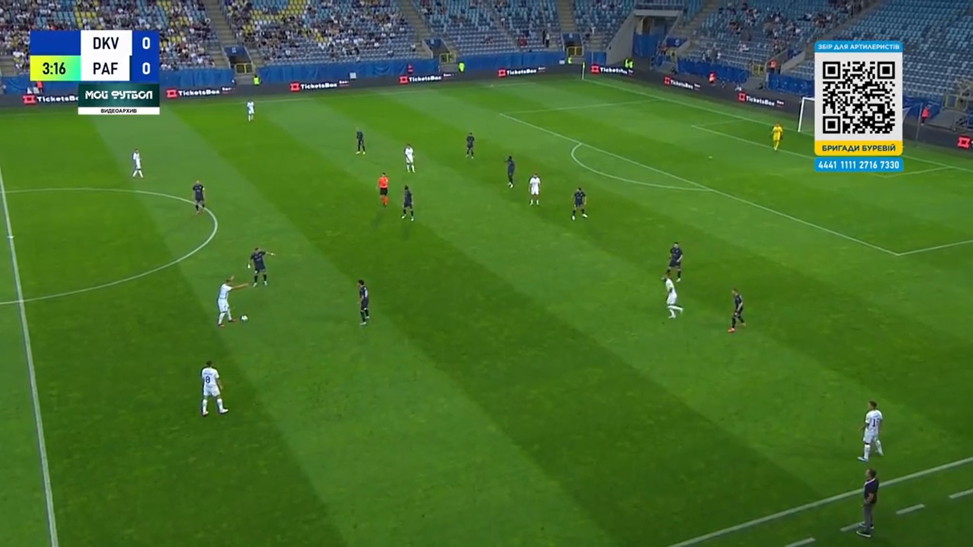 Фото 5. Бражко і Піхальонок відтягуються на свою половину поля. Вже 4 суперника на нашій половині. Дубінчак в глибокому тилу противника. Тимчика не видно, але припускаю, що десь на рівні Дубінчака чекає передачі. Попов відає передачу Піхальонку. Піхальонок приймає м’яча обличчям до своїх воріт. Його вже підтискає кіпріот.