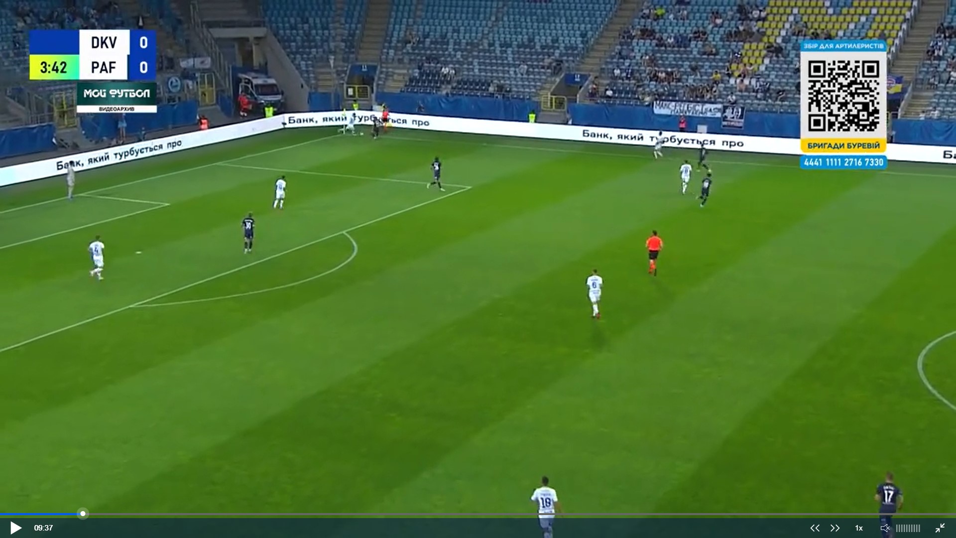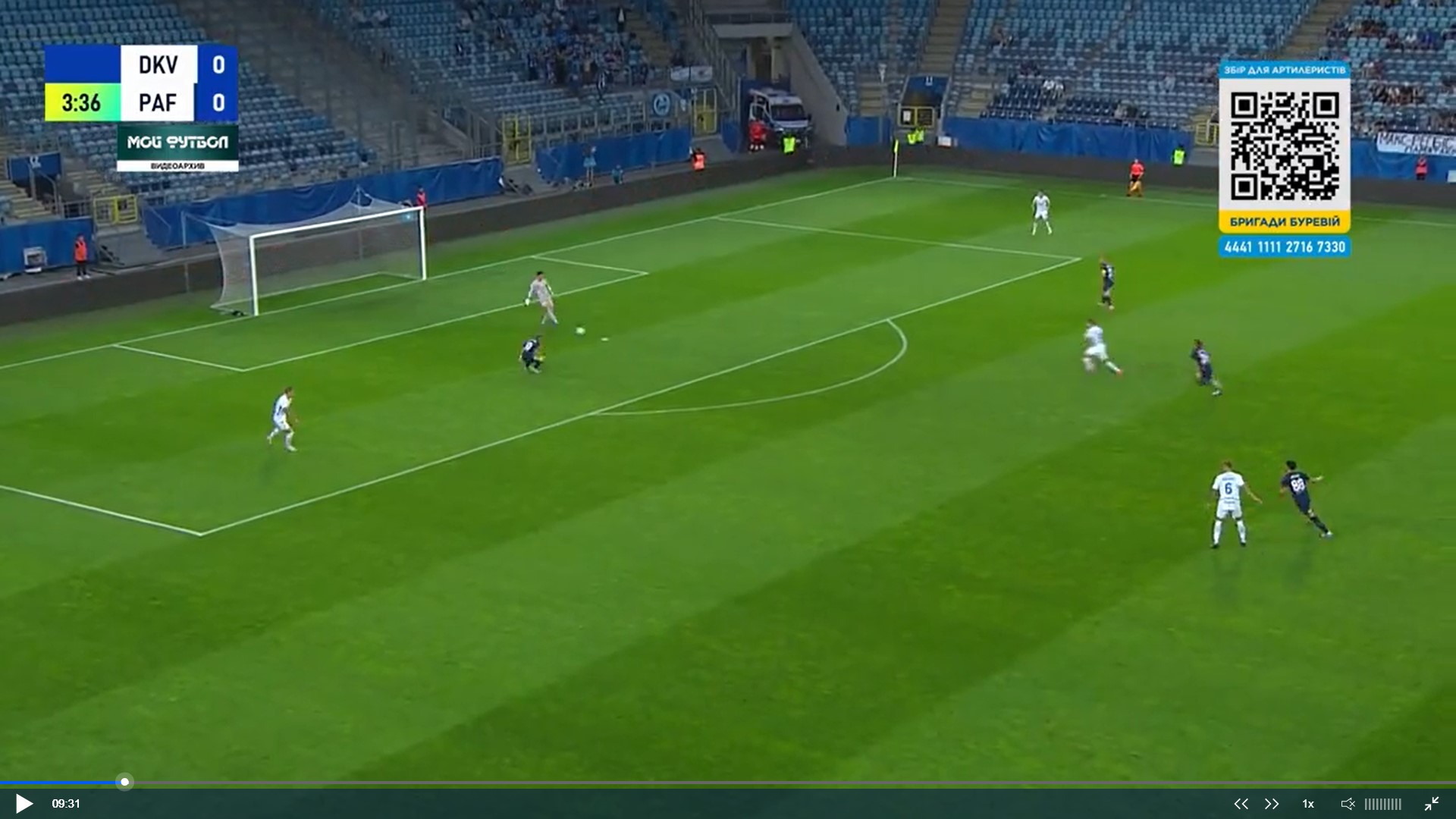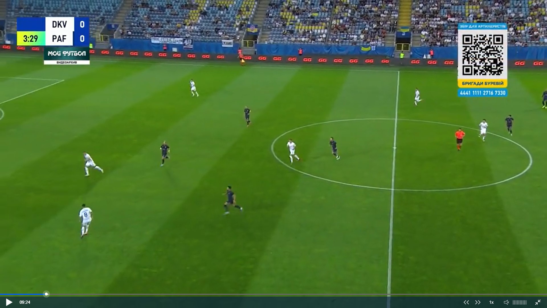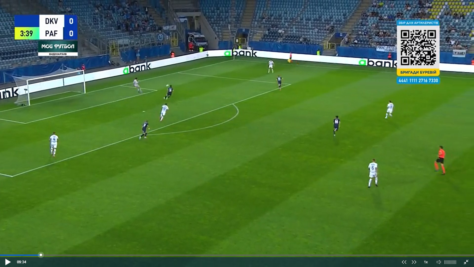 Фото 5. Бражко і Піхальонок відтягуються на свою половину поля. Вже 4 суперника на нашій половині. Дубінчак в глибокому тилу противника. Тимчика не видно, але припускаю, що десь на рівні Дубінчака чекає передачі. Попов відає передачу Піхальонку. Піхальонок приймає м’яча обличчям до своїх воріт. Його вже підтискає кіпріот.