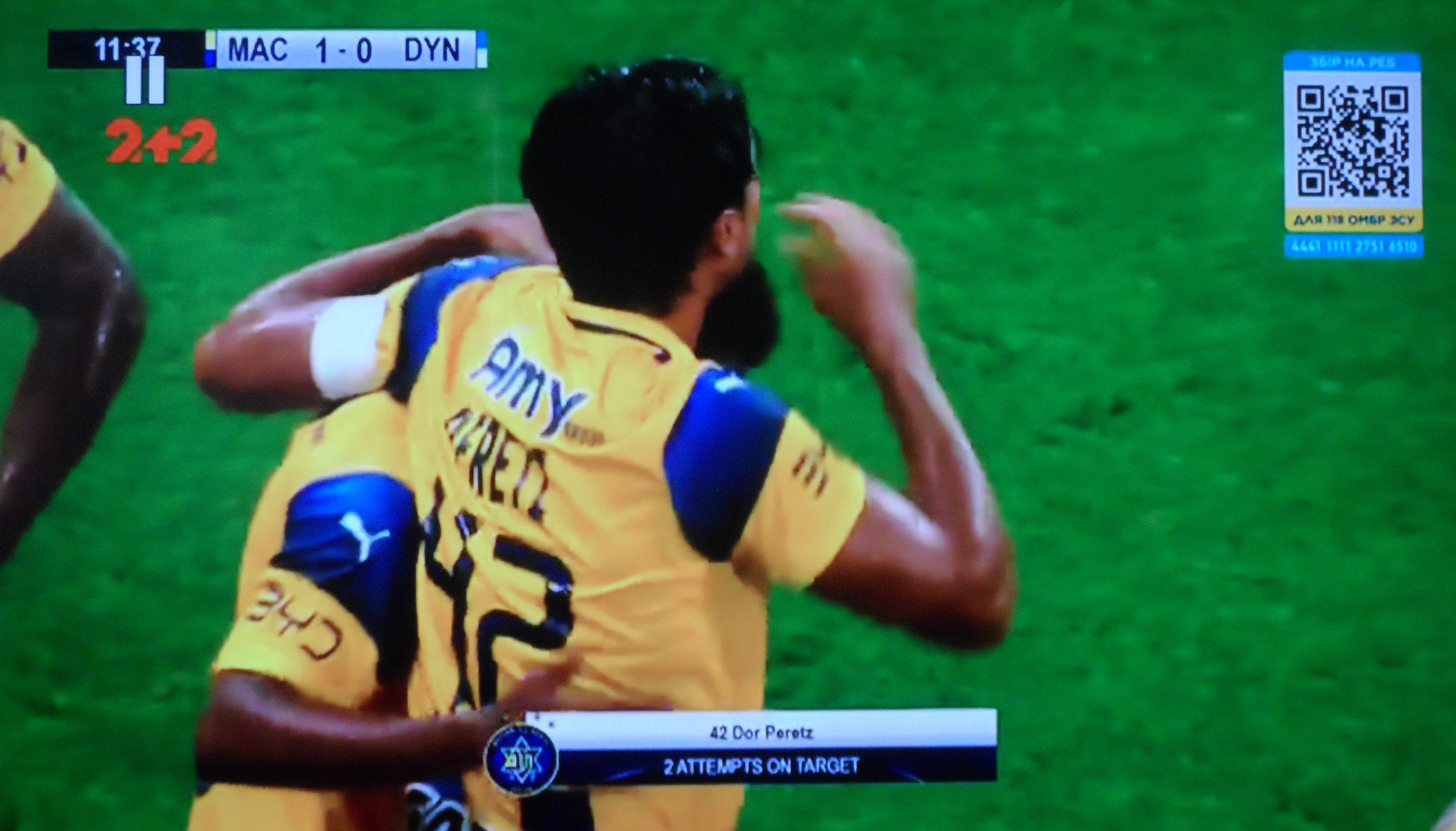 ГОЛ! Дор Перец виводить "Маккабі" вперед. Після швидкої комбінації у штрафній киян, Перец пробив сильно з кількох метрів повз Нещерета - 1:0.