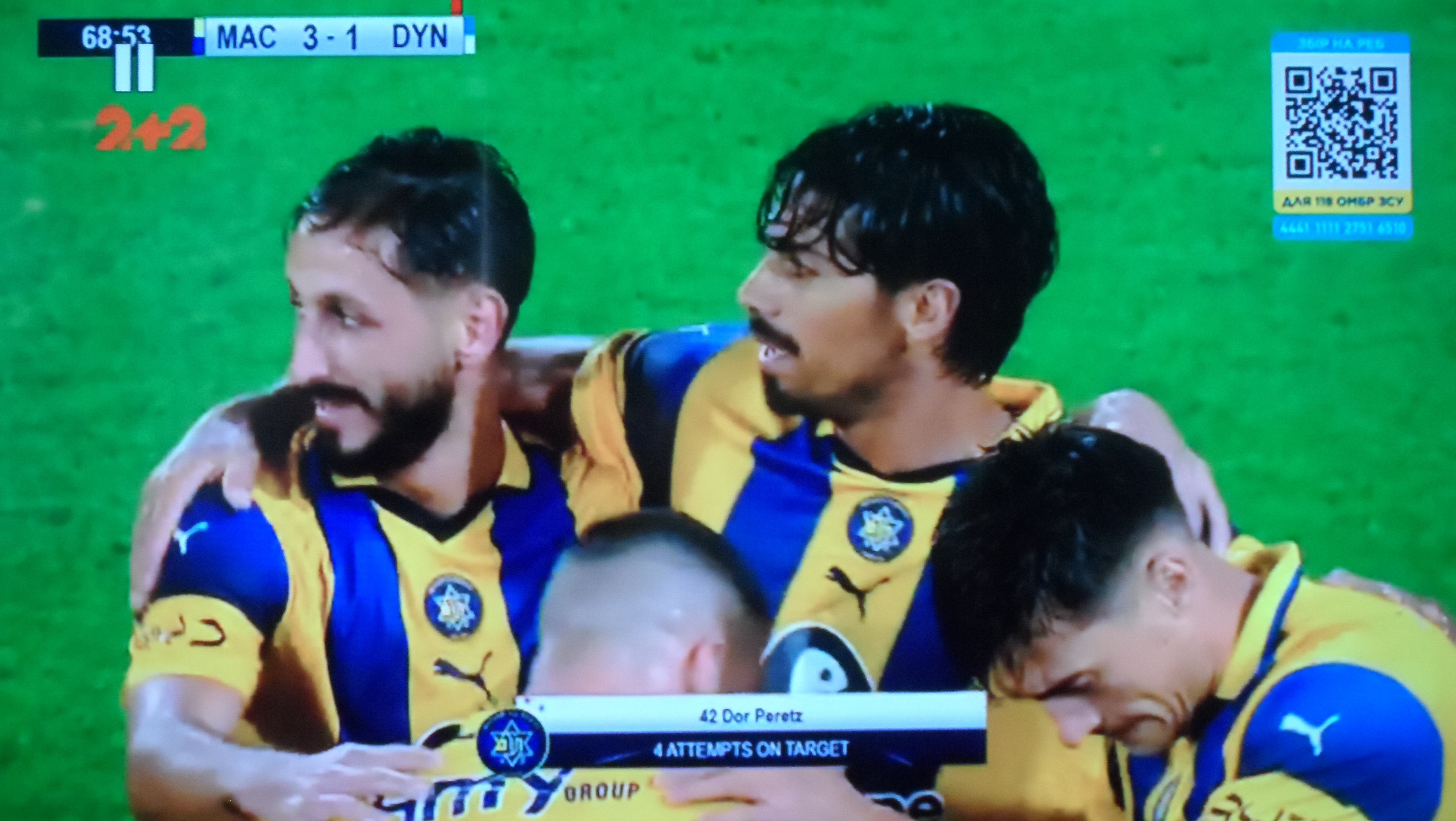 ГОЛ! Сагів Джезекель забиває другий гол "Маккабі". Після швидкої атаки по правому флангу і пасу в штрафну киян, Джезекель опинився сам на дальній стійці і пробив точно у порожні ворота - 2:1.