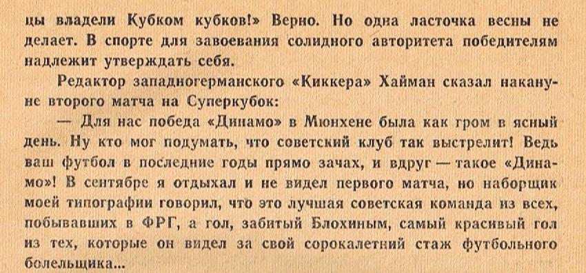 И согласитесь, как это здорово, что сегодня - 50 лет спустя! - мы можем увидеть самый красивый гол среди тех, которые наборщик западногерманского "Киккера" видел за свой сорокалетний стаж болельщика.