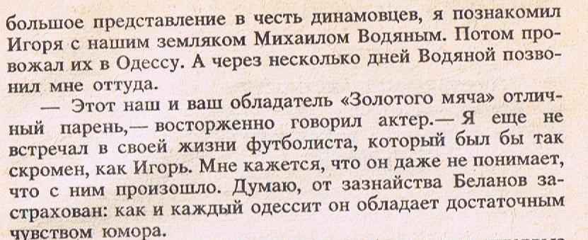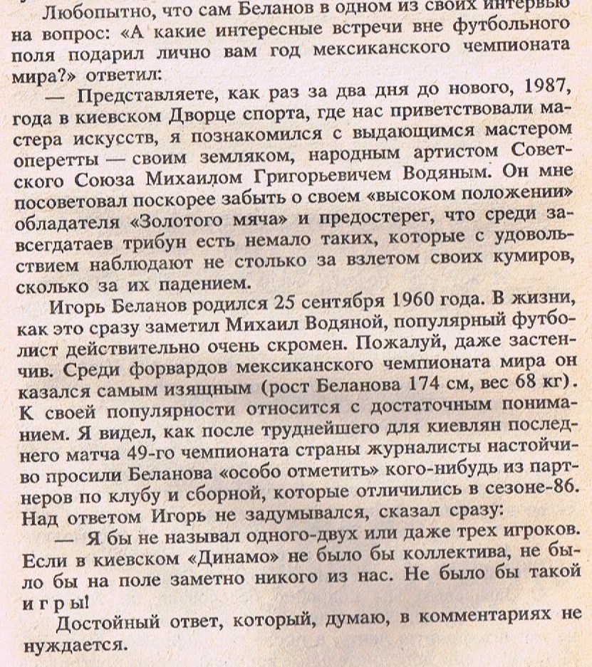По тому, небольшому количеству лет, сыгранных за киевское "Динамо", Игорь Беланов пронесся, как метеор. Иными словами, как и играл незабываемо. Особенно в 1985 - 88 г.г. Как своевременно он перешел в "Динамо", доказав, что способные футболисты должны играть в великих командах и у великих тренеров!