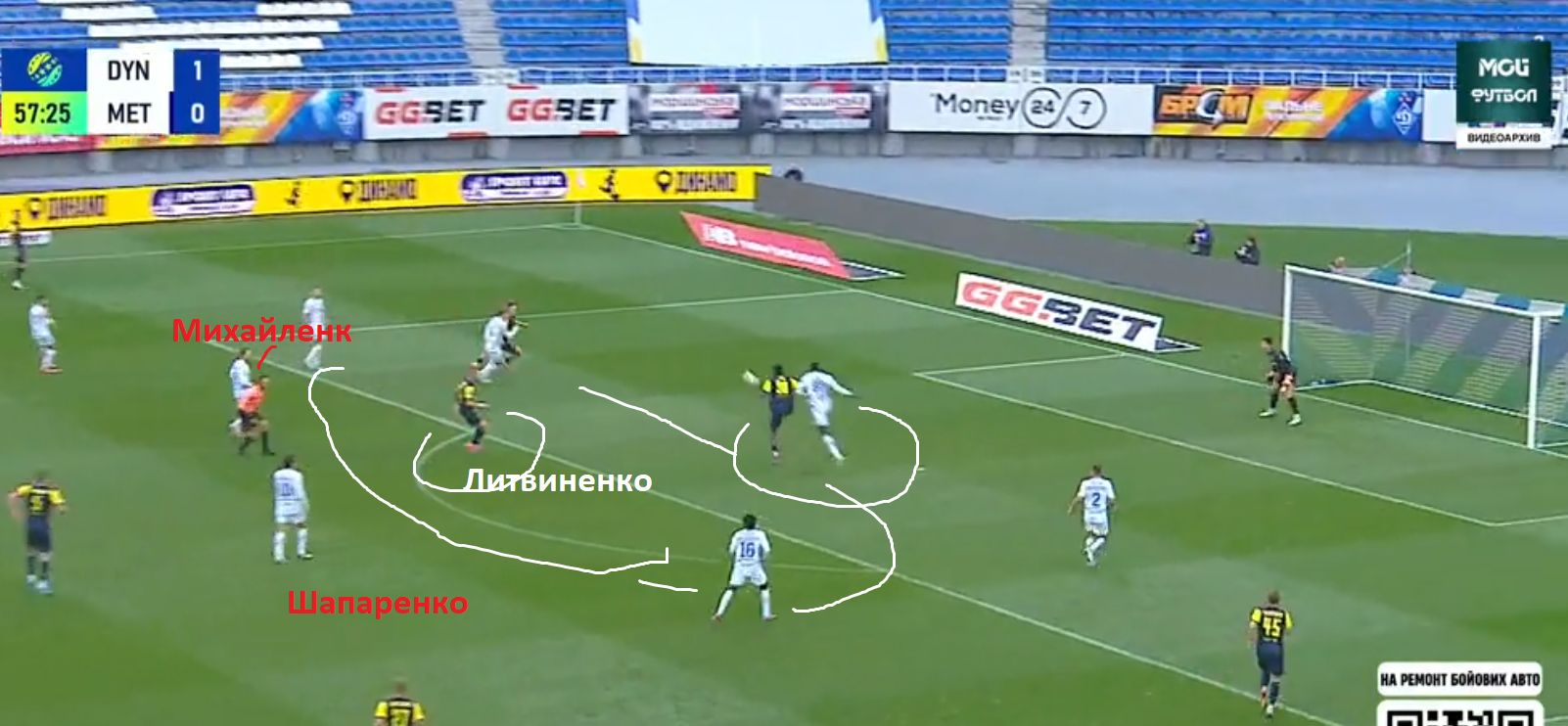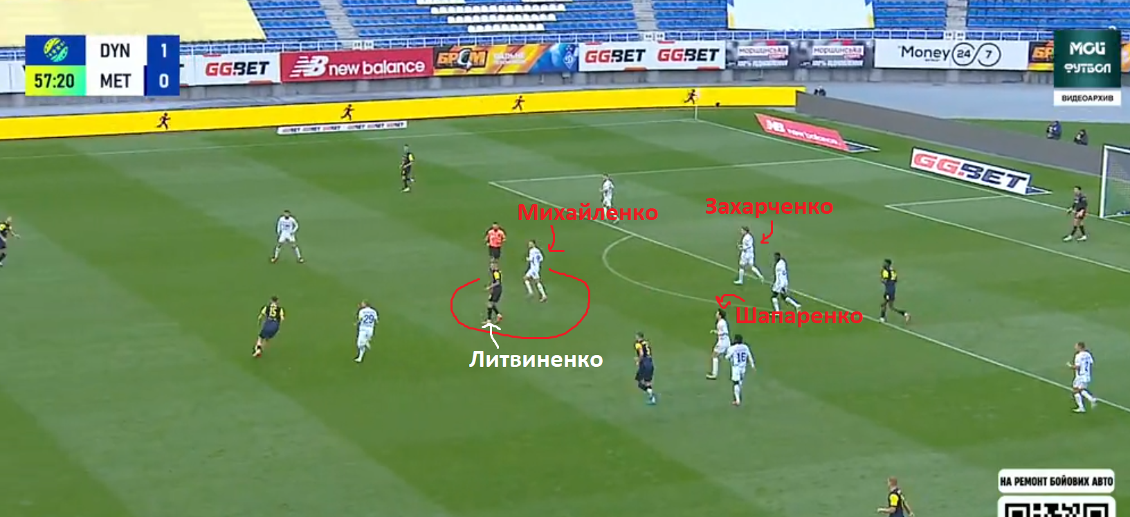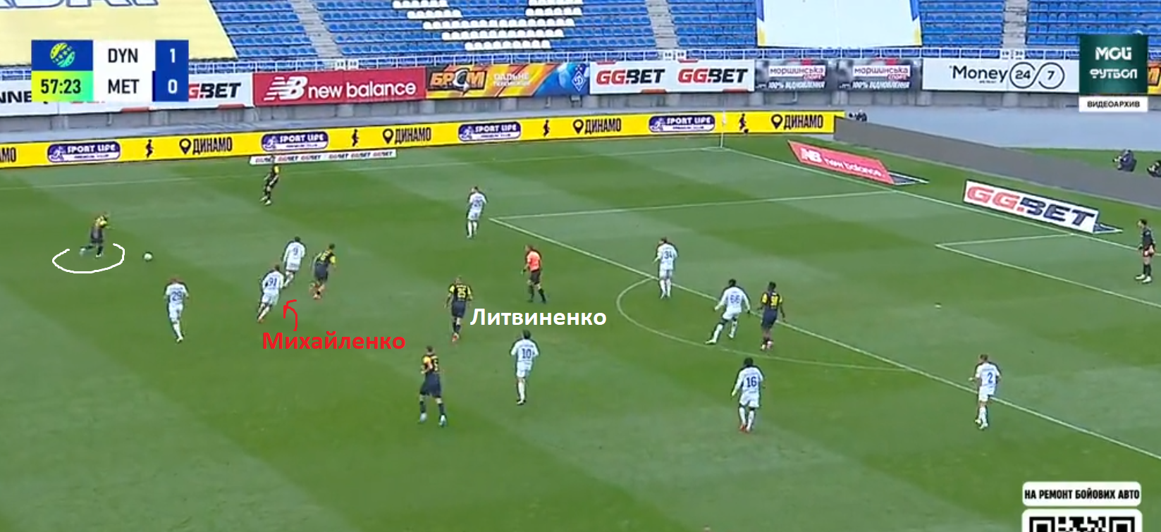 5 Михайленко выдвигается вперед, атакуя игрока Мет25, при этом оставляя зону без присмотра.