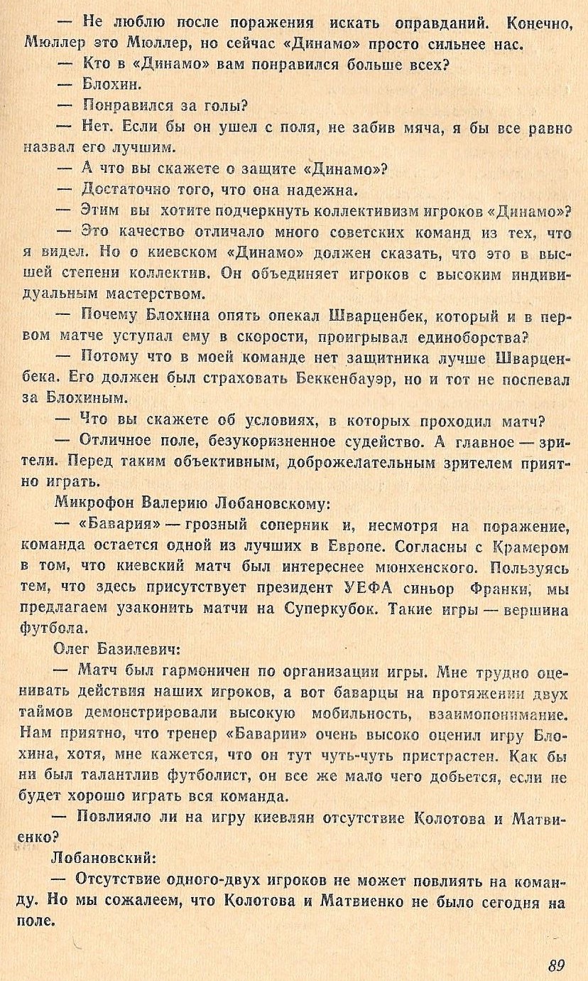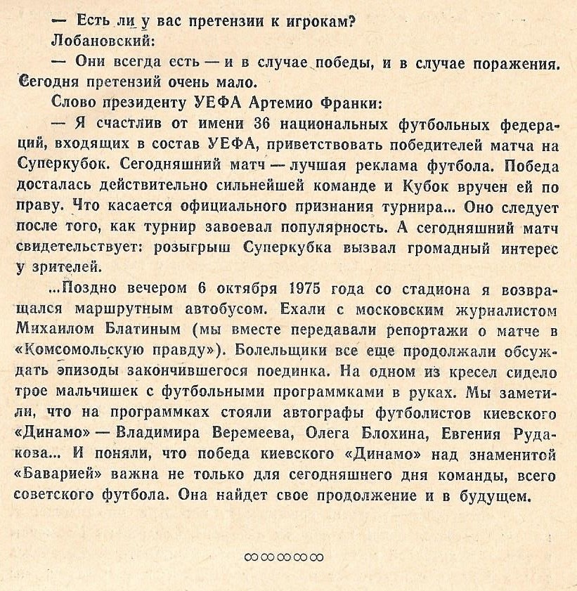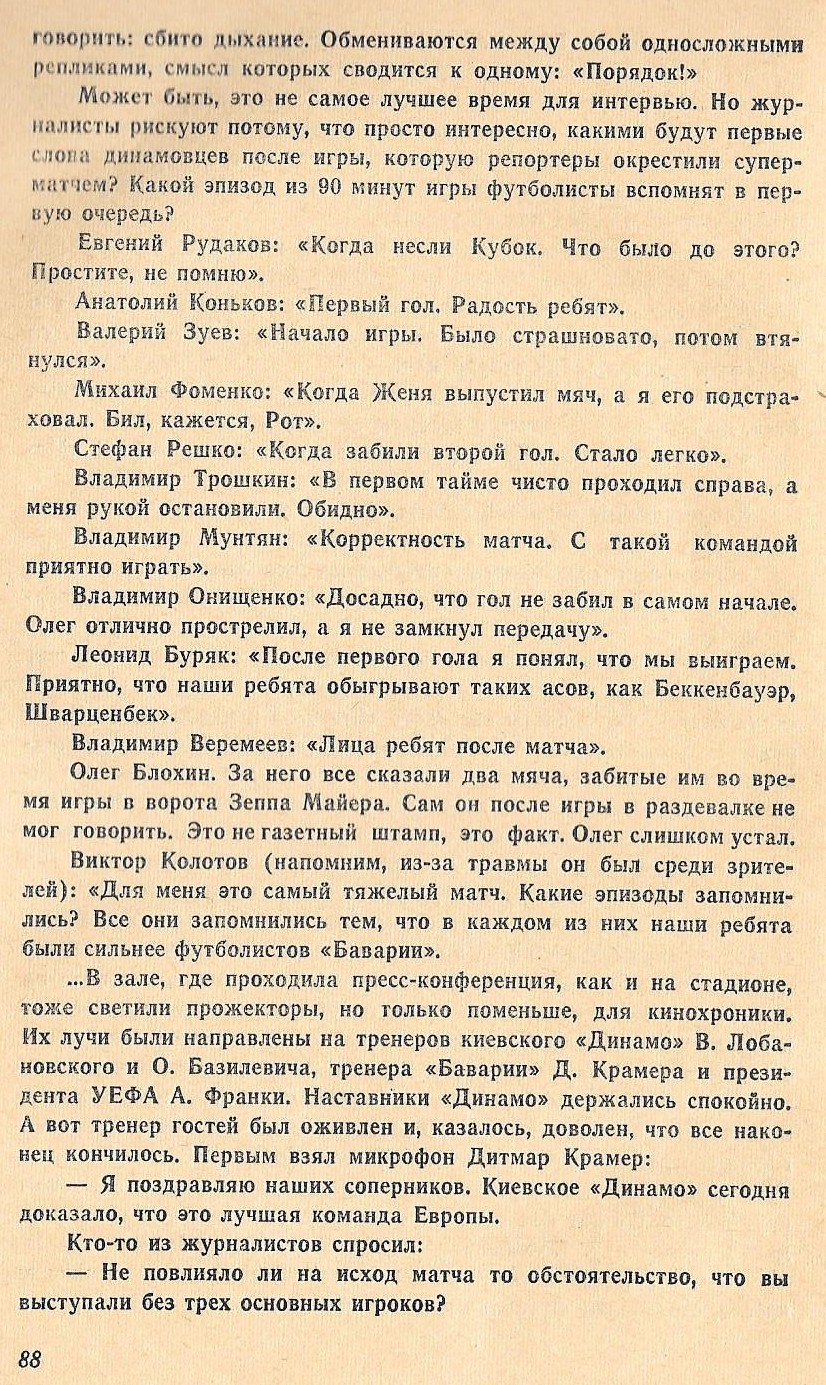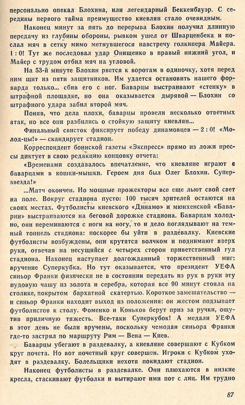 Под занавес этого долгого рассказа одна просьба. Если не трудно, перечитайте заключительный абзац главы: всего-то 11 (символическое для футбола число!) строчек. Это, пожалуй, единственное место в моей первой книжке, где мне разрешили сказать от первого лица. И за это я благодарен своему редактору Ольге Мищенко, которая убедила меня, что так будет лучше... для рукописи, которая быстрее станет книжкой. В такое время мы жили. Впрочем, главное, разумеется, не в этом, а в том, что победа киевского «Динамо» над знаменитой «Баварией» действительно нашла своё продолжение в истории легендарного клуба...