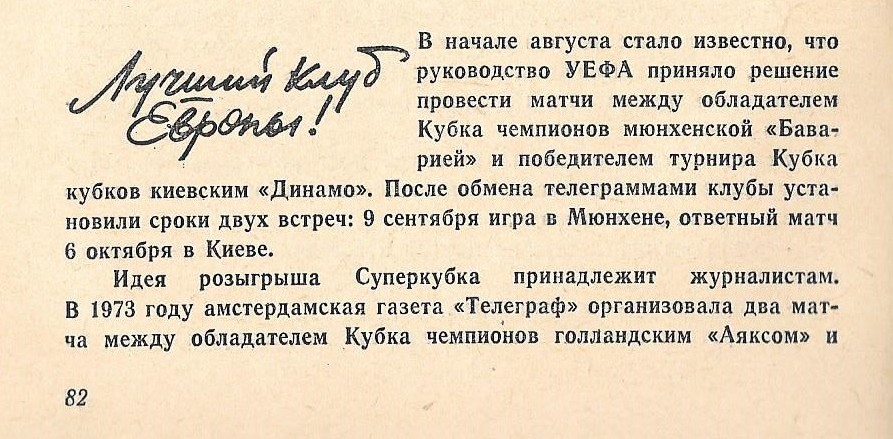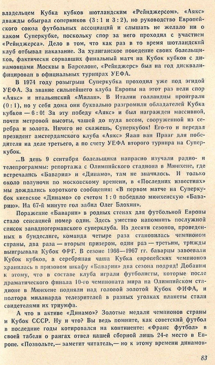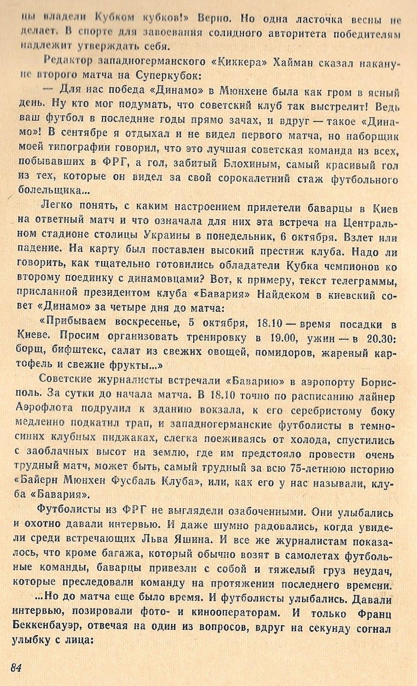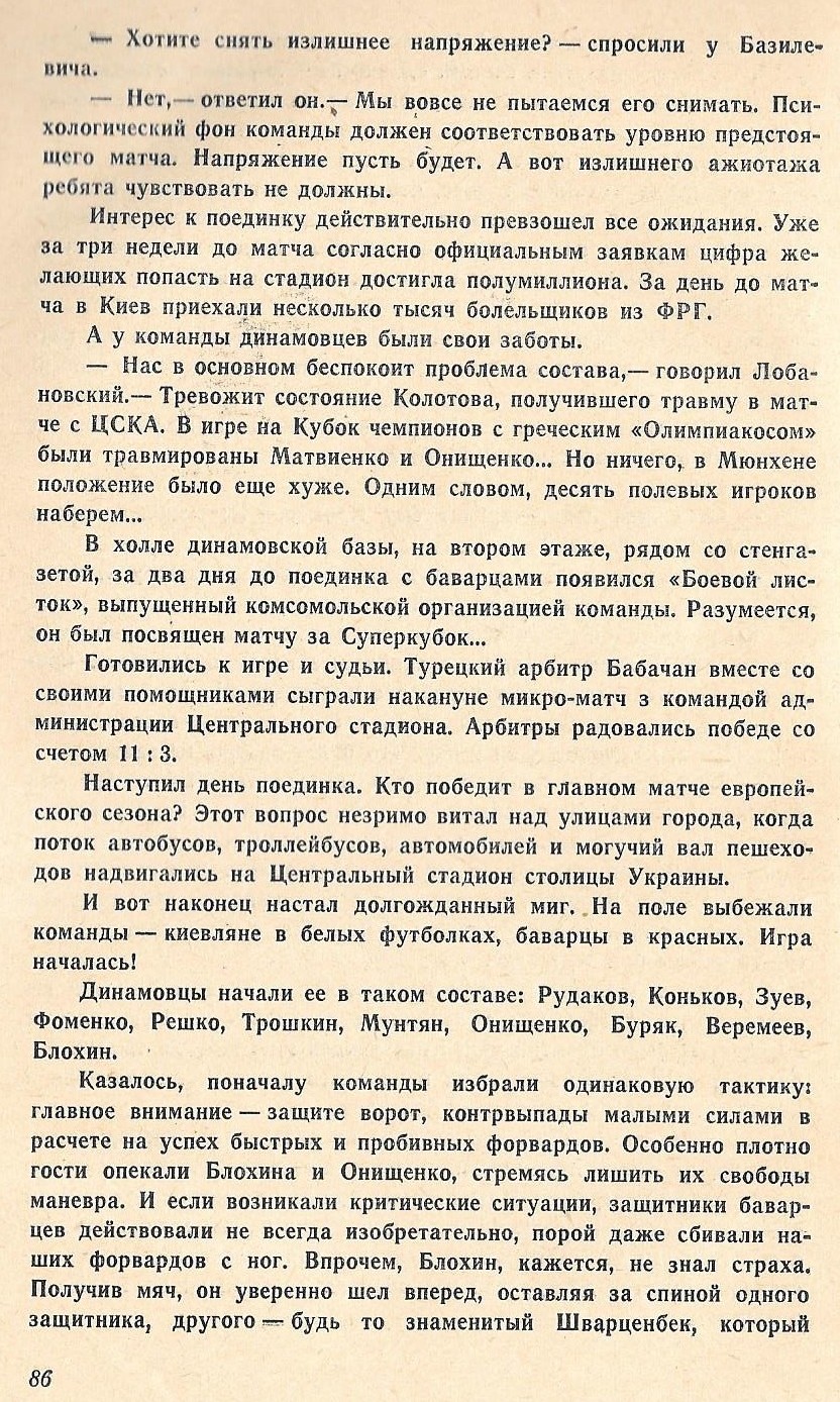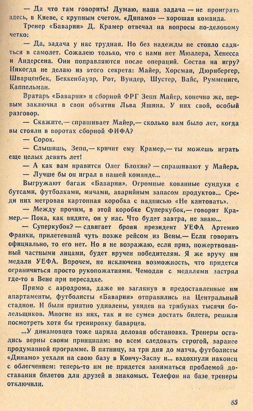 Под занавес этого долгого рассказа одна просьба. Если не трудно, перечитайте заключительный абзац главы: всего-то 11 (символическое для футбола число!) строчек. Это, пожалуй, единственное место в моей первой книжке, где мне разрешили сказать от первого лица. И за это я благодарен своему редактору Ольге Мищенко, которая убедила меня, что так будет лучше... для рукописи, которая быстрее станет книжкой. В такое время мы жили. Впрочем, главное, разумеется, не в этом, а в том, что победа киевского «Динамо» над знаменитой «Баварией» действительно нашла своё продолжение в истории легендарного клуба...