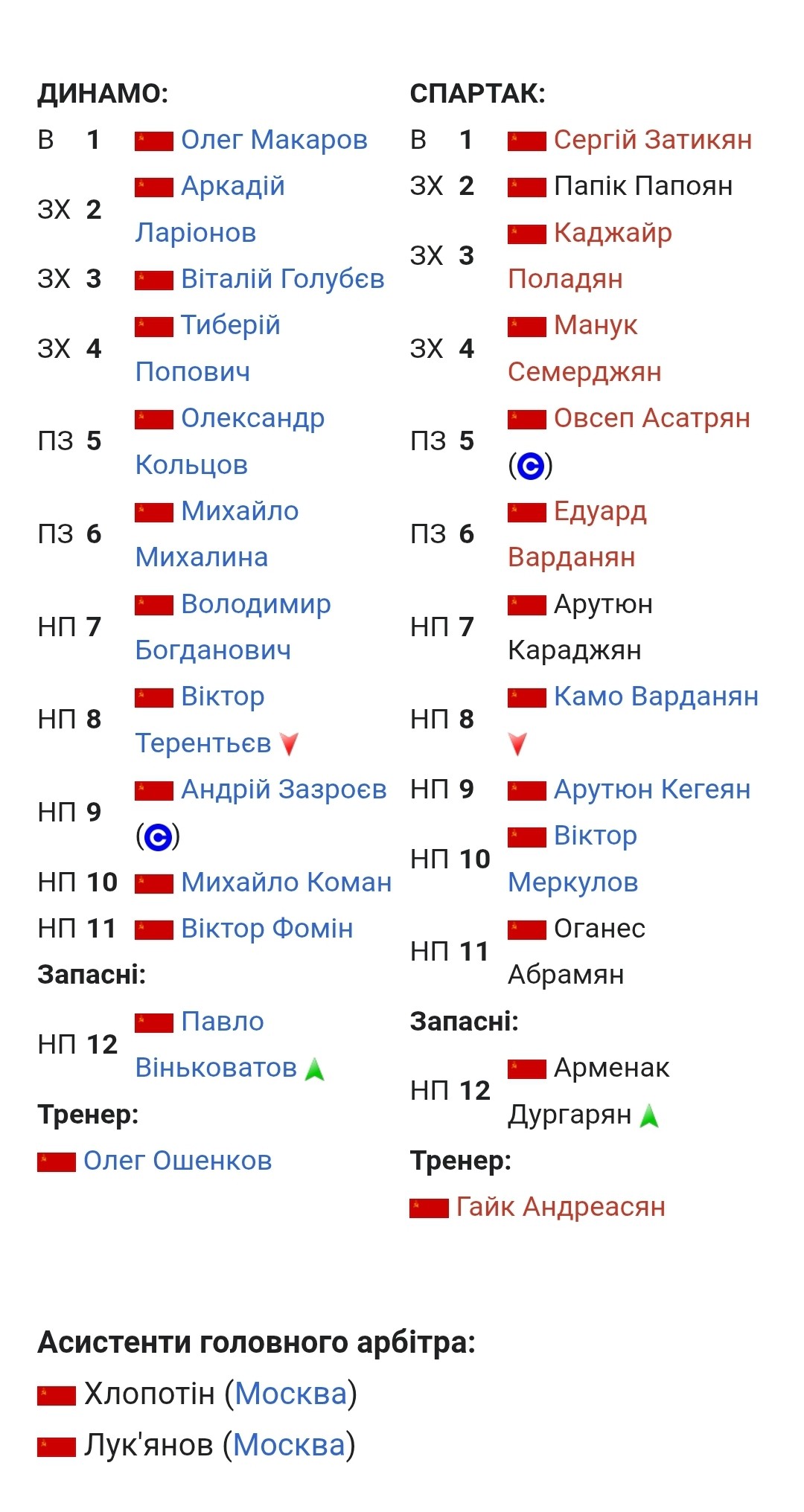 «СПАРТАК» ЄРЕВАН: Затикян, Папоян, Поладян, Семерджян, Асатрян, Е.Варданян, Караджян, К.Варданян (Дургарян), Кегеян, Меркулов, О.Абрамян. Головний тренер – Гайк Андріасян.