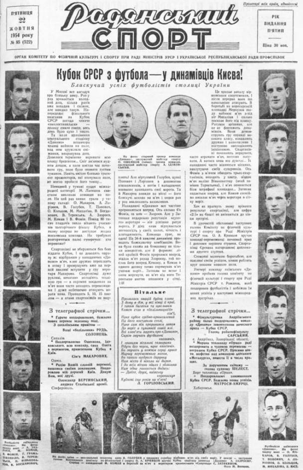 У 1954 році київське «ДИНАМО» зустрілося з командою «СПАРТАК» (Арарат) з Єревана у фіналі Кубка срср з футболу, в якому кияни перемогли з рахунком 2:1. Це була перша перемога «Динамо» у цьому турнірі та перша перемога команди не з мацкви за всю історію Кубка срср.