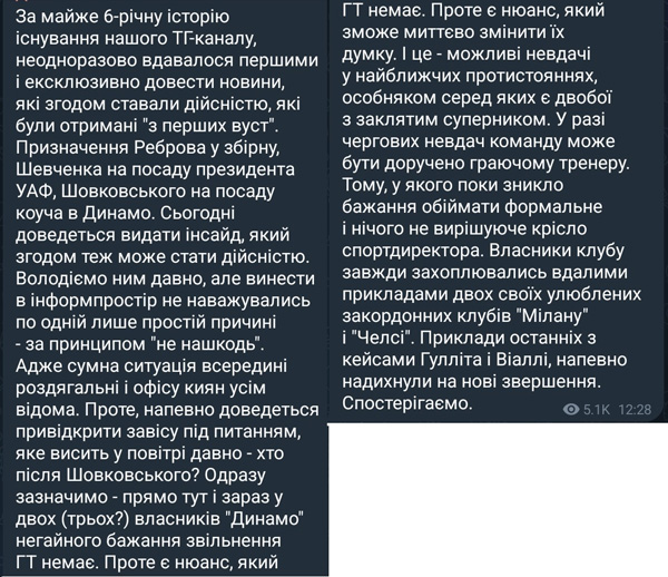 Чего это я про Ярмоленко вспомнил... А, вот чего. Есть такой чувак, малорик Шахов. Малорик в смысле младший. Ну и молодец тоже конечно, а как иначе, такой молодой, а сколько уже прессаташит в Динамо. В последнее время правда чё-то как-то не очень у него, но не суть. Так вот был у него, как это нонче модно, "ононимный" телеграмм-канал. Хотя почему был, и сейчас есть, но когда младшему в Динамо стульчик выделили, он его как-то совсем подзабросил от слова вообще. А сейчас не пойми чего, то ли скучно стало отстранённому, то ли обиделся, то ли кто-то взрослый попросил, но бомбанул телеграмм-канал вот такую нифига себе телегу -