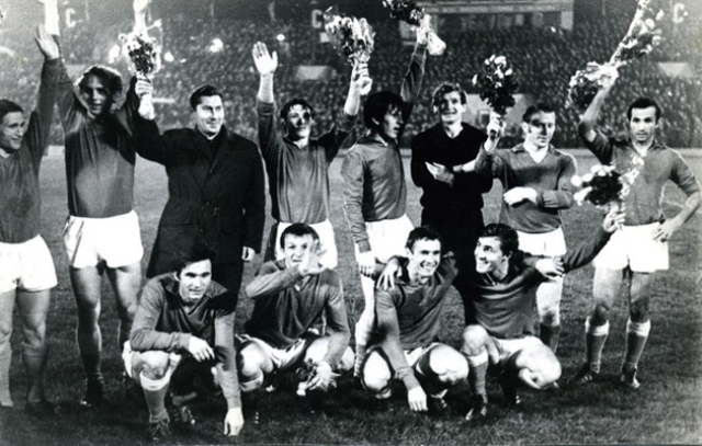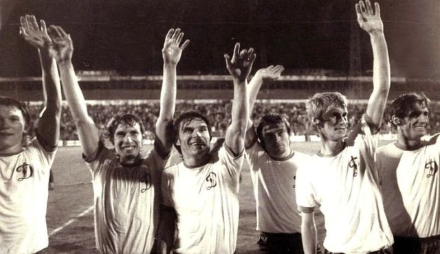 14 мая 1975 года. Остановленное мгновенье, несколько минут спустя, после убедительной победы ДИНАМОвцев в финальном матче над «Ференцварошем». Советский клуб впервые стал обладателем Кубка кубков УЕФА. Слева – направо: Олег БЛОХИН, Владимир ОНИЩЕНКО, Владимир ТРОШКИН, Виктор МАТВИЕНКО, Леонид БУРЯК, Стефан РЕШКО.