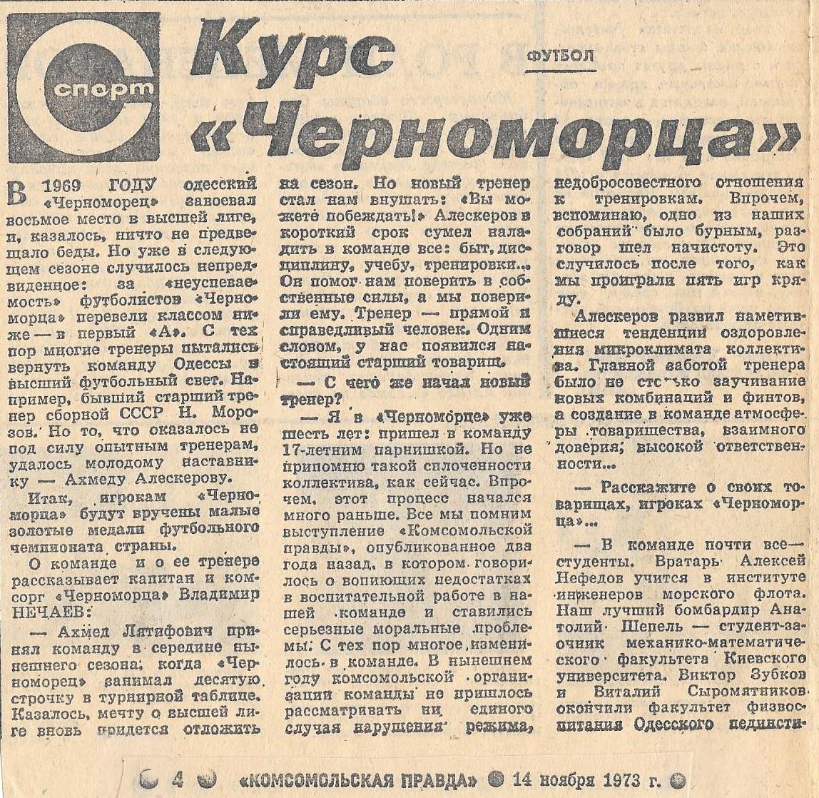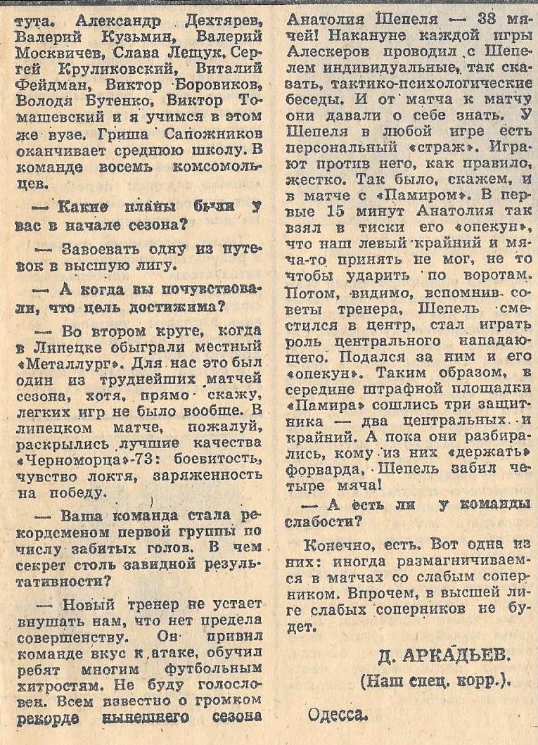 Земляки-одесситы, полагаю, по обе стороны океана, если они неравнодушны к футболу, со мной согласятся, что нам таки да есть что и кого вспоминать в сезоне 1973 года, когда «Черноморец» завоевал малые золотые медали первой лиги.