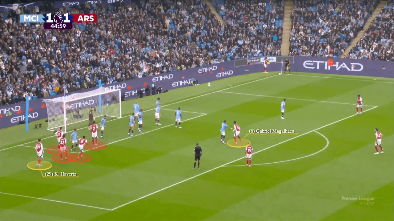 А ось вам дальня штанга – гол Габріела в ворота Ман Сіті. Тут все те саме, тільки бразилець робить півколо в інший бік, де Кай Гаверц його чекав і "зняв" з плечей партнера Кайла Вокера, дозволивши вільно пробити. Едерсон теоретично міг би дістати навіс, але куди він вийде, якщо у воротарському одночасно Мартінеллі, Саліба та їхні опікуни?