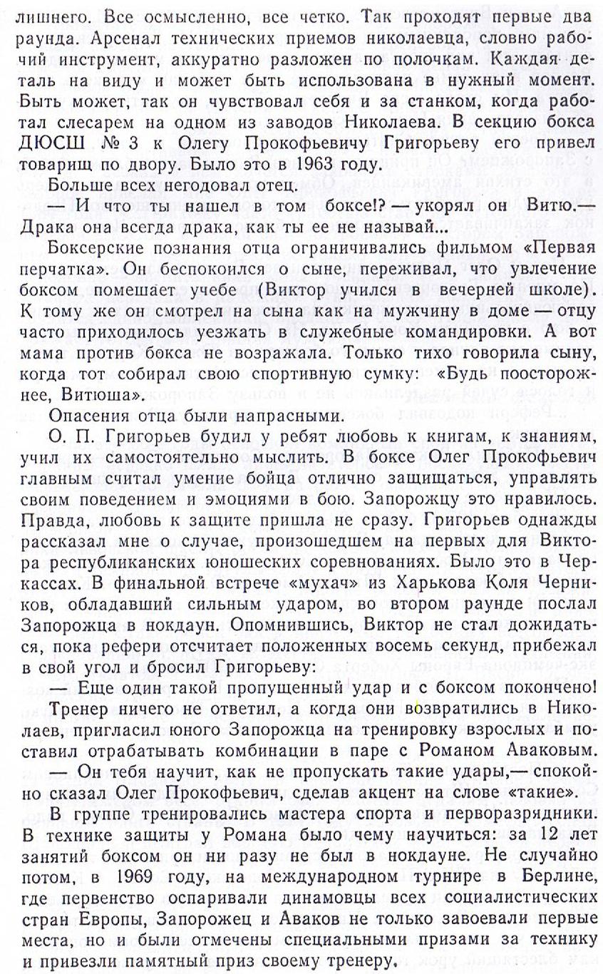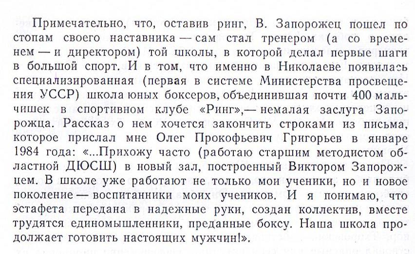 Напоследок рекомендую: перечитайте заключительные строки моего рассказа о Запорожце, в которых я цитирую слова Олега Прокофьевича Григорьева из его письма 42-летней давности. Замечательные строки об украинцах, которые приходят в боксёрские залы, где воспитывают настоящих мужчин.
