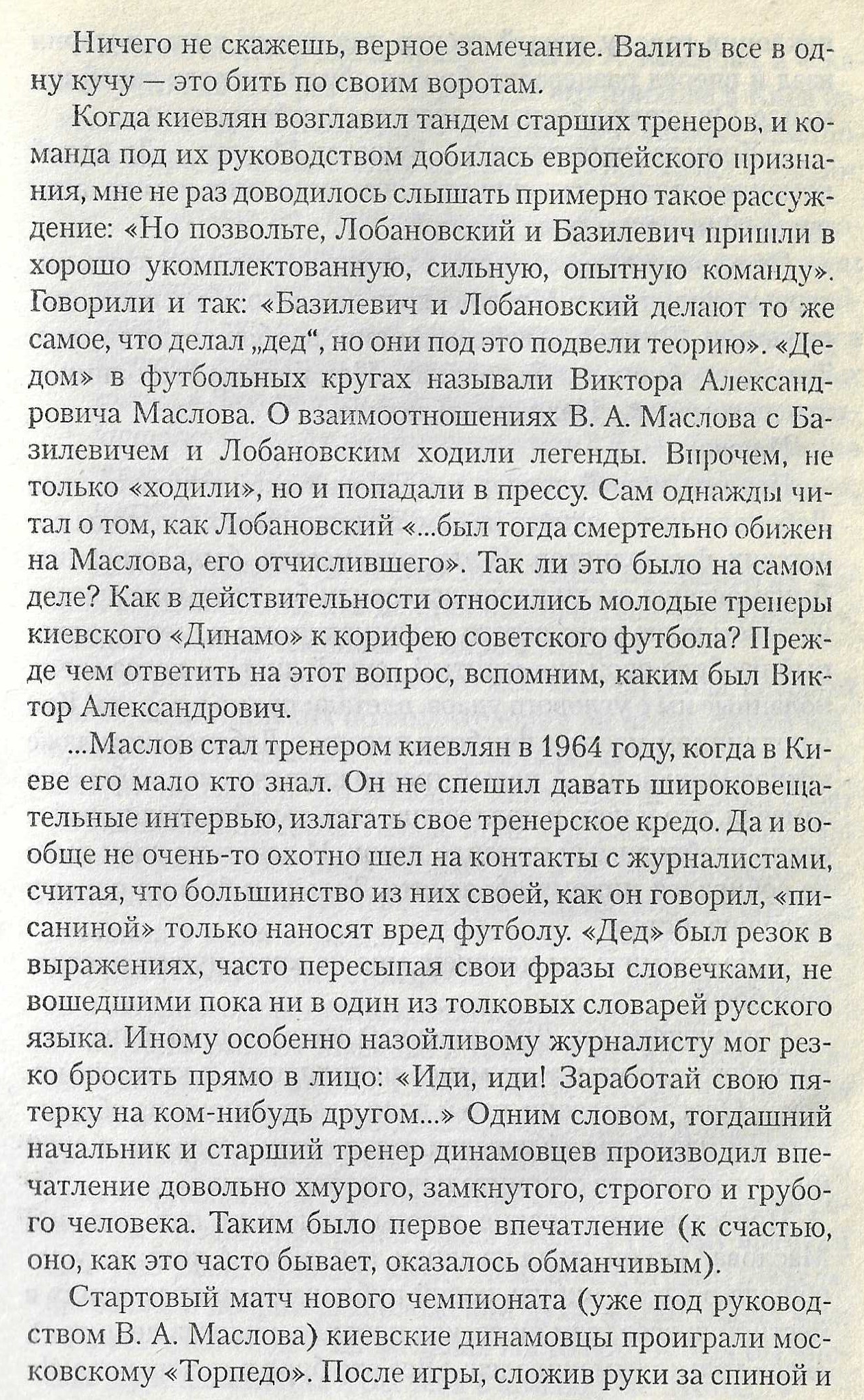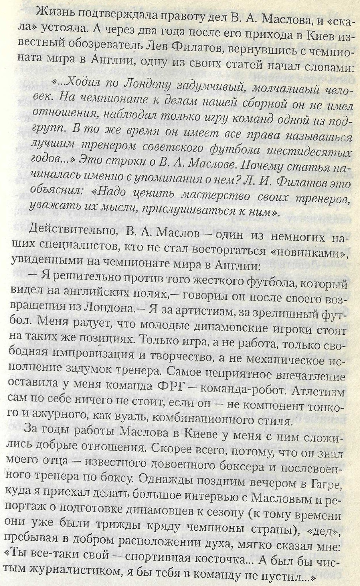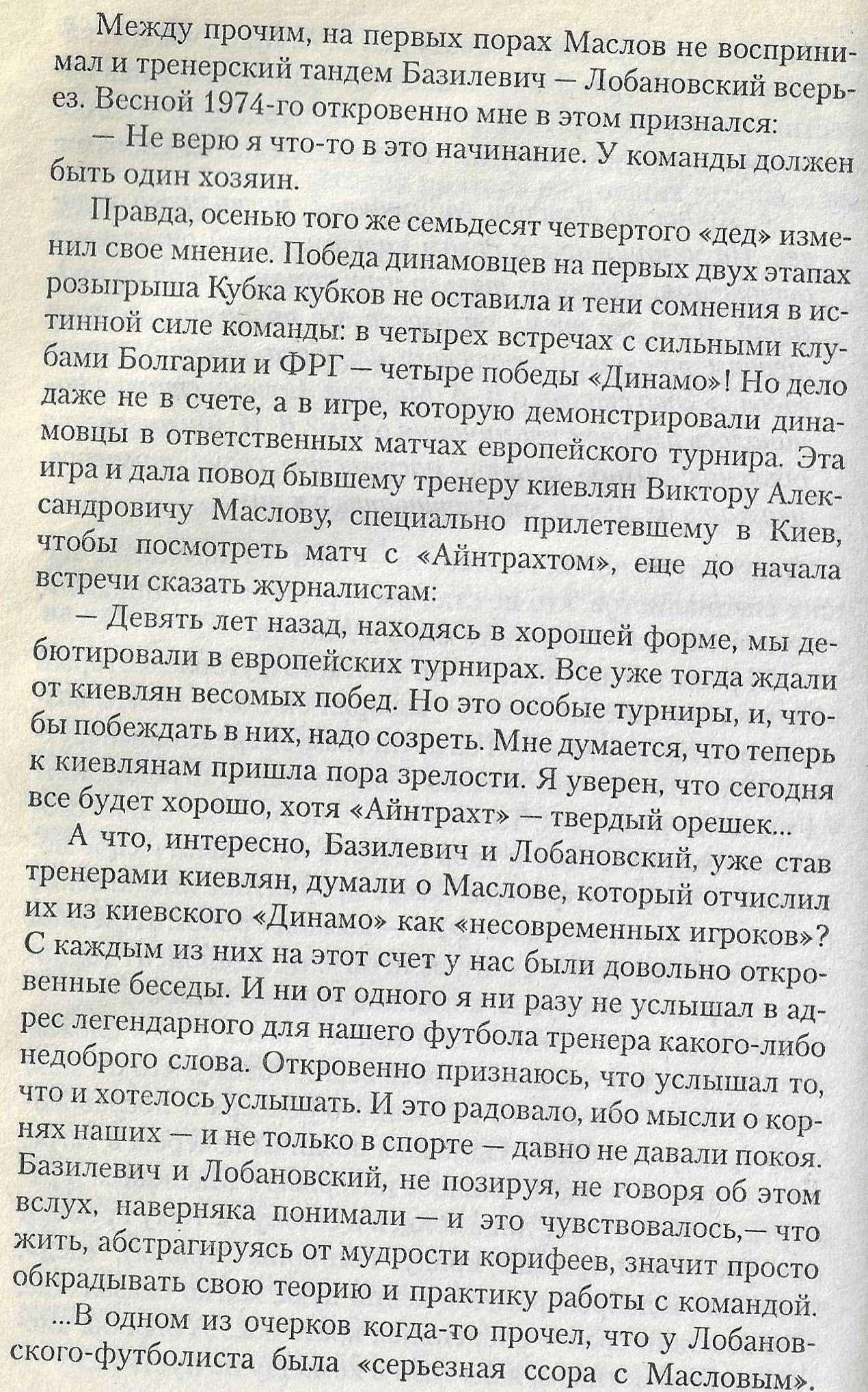 К примеру, Базилевич, рассказывал мне о том, как он с Лобановским переосмыслили роль «Деда» в их тренерских судьбах, о поездке на чемпионат мира - 1966 в Лондон Маслова, в ту пору старшего тренера киевского «Динамо». Мог ли Олег предположить, что сам - в такой же роли! - отправится на ЧМ - 1974 в Германию!? Впрочем, это уже другая история, рассказанная в этой же главе книги...