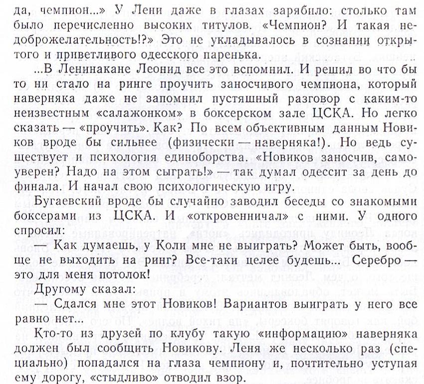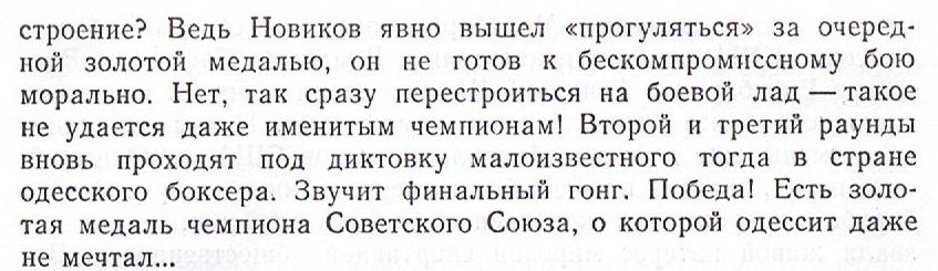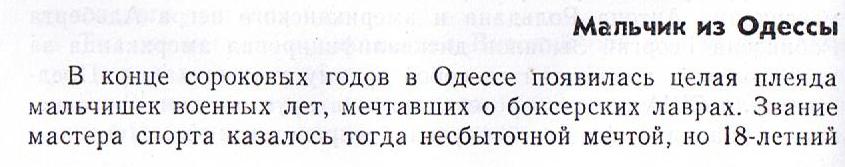 А напоследок, обращаюсь к вам, читатель, с творческим предложением. Чуть выше поднимите свой взгляд и ещё раз, пожалуйста, перечитайте заключительные пять (всего-то!) строк из этой главы. И поделитесь своей точкой зрения, может ли жизненный путь этого "мальчика из Одессы", без особых внешних данных, выросшего в обыкновенной одесской семье, стать примером для юных украинцев, мечтающих о победах в большом спорте!? Но как они о нём узнают (с нынешним-то засилием гаджетов?!), если им не порекомендуют подобное чтиво их первые тренеры, старшие товарищи, родители, наконец. А кто, если не мы, поведает о такой возможности - приобщиться, к тотому" что именуется словом о п ы т...
