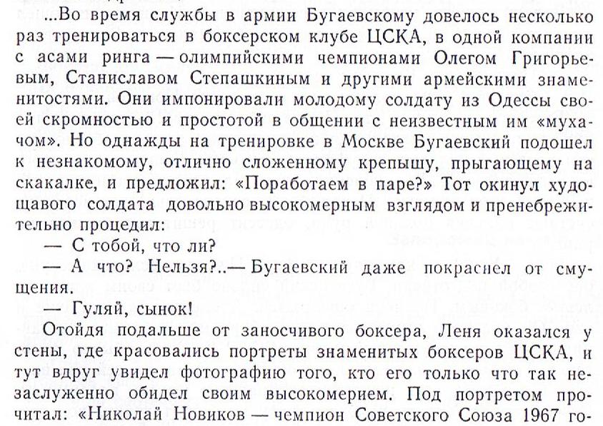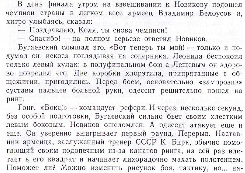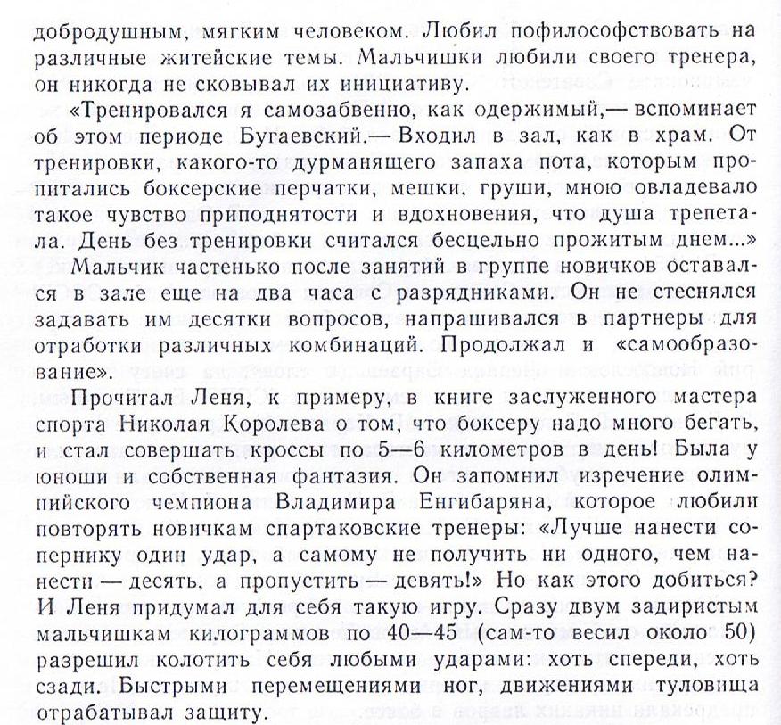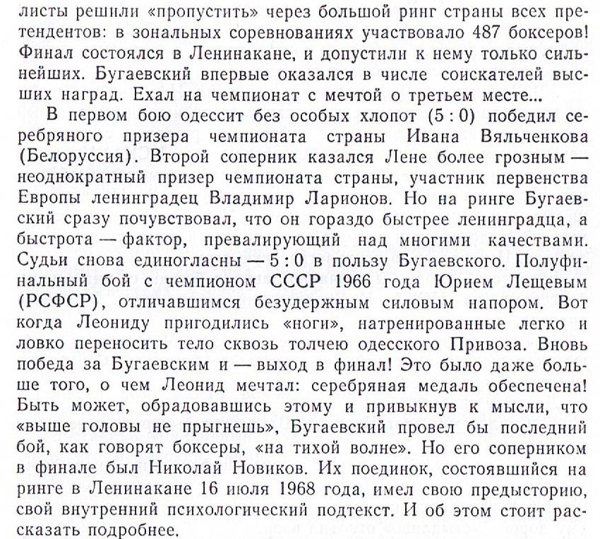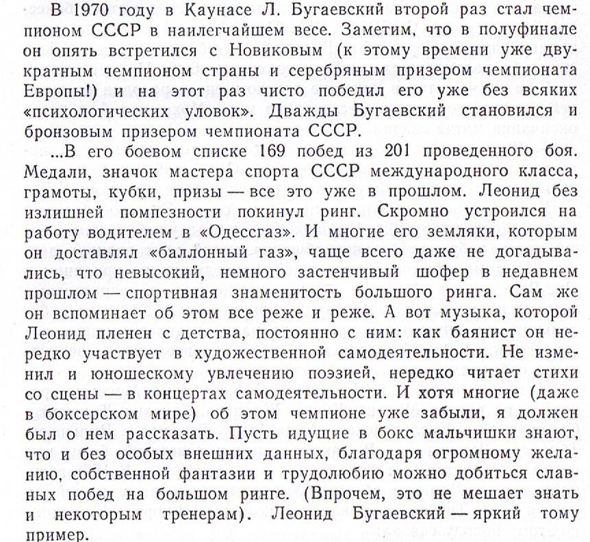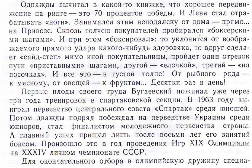 Как уже писал раньше, в пору советского антисемитизма, мне запретили упоминание в моей книге всех, кто уехал из страны. Так что именно по этим причинам не мог я, рассказывая о Бугаевском, поведать читателям о том, что как боксёр он многому научился у Семёна Трестина. Часто напрашивался в спартаковскую группу, в которой я работал со сборной облсовета, в которую входил и Трестин, к тому времени уже выполнивший норму мастера спорта СССР и дважды побеждавший на чемпионатах Украины. Во время спаррингов Лёня не раз напрашивался и в пару к Семёну. Мне импонировала любовь Бугаевского к спортивной литературе вообще и к книгам о боксе в частности.