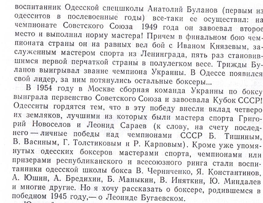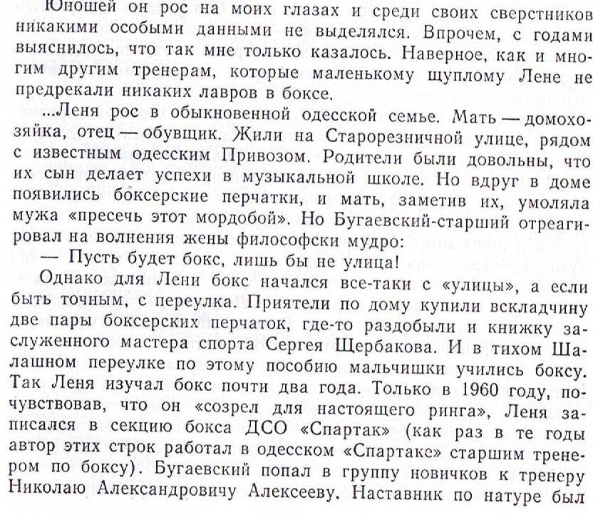 В те годы я работал старшим тренером Одесского облсовета общества "Спартак". В нашем небольшом зале, что помещался на первом этаже в Доме профсоюзов, в самом центре города, своими большими окнами выходил прямо на улицу Жуковского. Лёня однажды признался, что частенько заглядывал с улицы в этот зал, когда там тренировался Семён Трестин, единственный из советских боксёров обладатель Кубка боксёрского Оскара в Белграде. Он был старше Бугаевского на пять лет и уже известен в ту пору одесским мальчикам, полюбившим бокс.