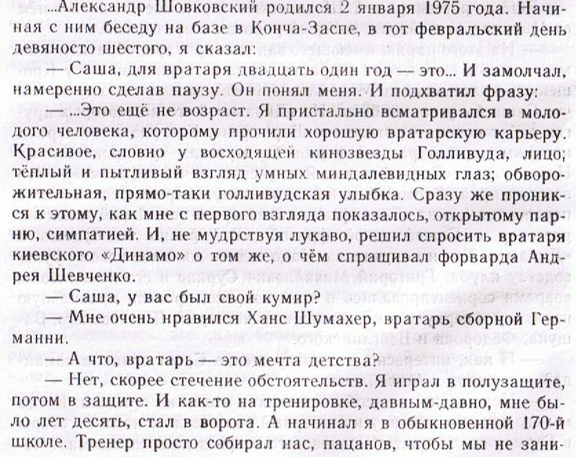Да, блистательный вратарь, слава Богу, в ту пору ещё продолжая свою футбольную биографию, вошёл в мировую историю футбола. Впрочем, только ли футбола!? С моей точки зрения, Саша, как обращаюсь к нему (когда, как говорится, один на один) с его 19-летнего возраста, вошёл в современную историю многотрудной и драматической жизни Украины. Об этом однажды уже писал. как о прекрасной и мужественной гражданской позиции украинца Шовковского, чему был невольным свидетелем. Но сейчас не об этом.