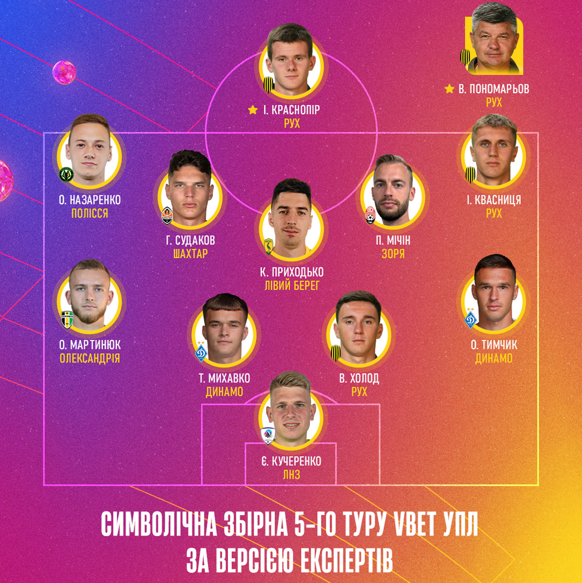 Auswahl der 5. Runde der UPLDie Bestimmung der Besten erfolgte traditionell durch eine Umfrage unter Vertretern ukrainischer Sportmedien. Jeder der Befragten nannte eine Dreiergruppe von Kandidaten für den Titel Trainer der Runde, eine Fünfergruppe für den Titel Spieler der Runde und stellte auch seine eigene Version der symbolischen Auswahl der Runde zusammen.