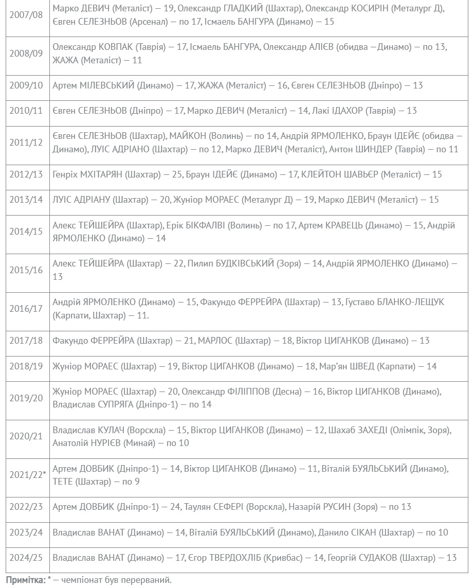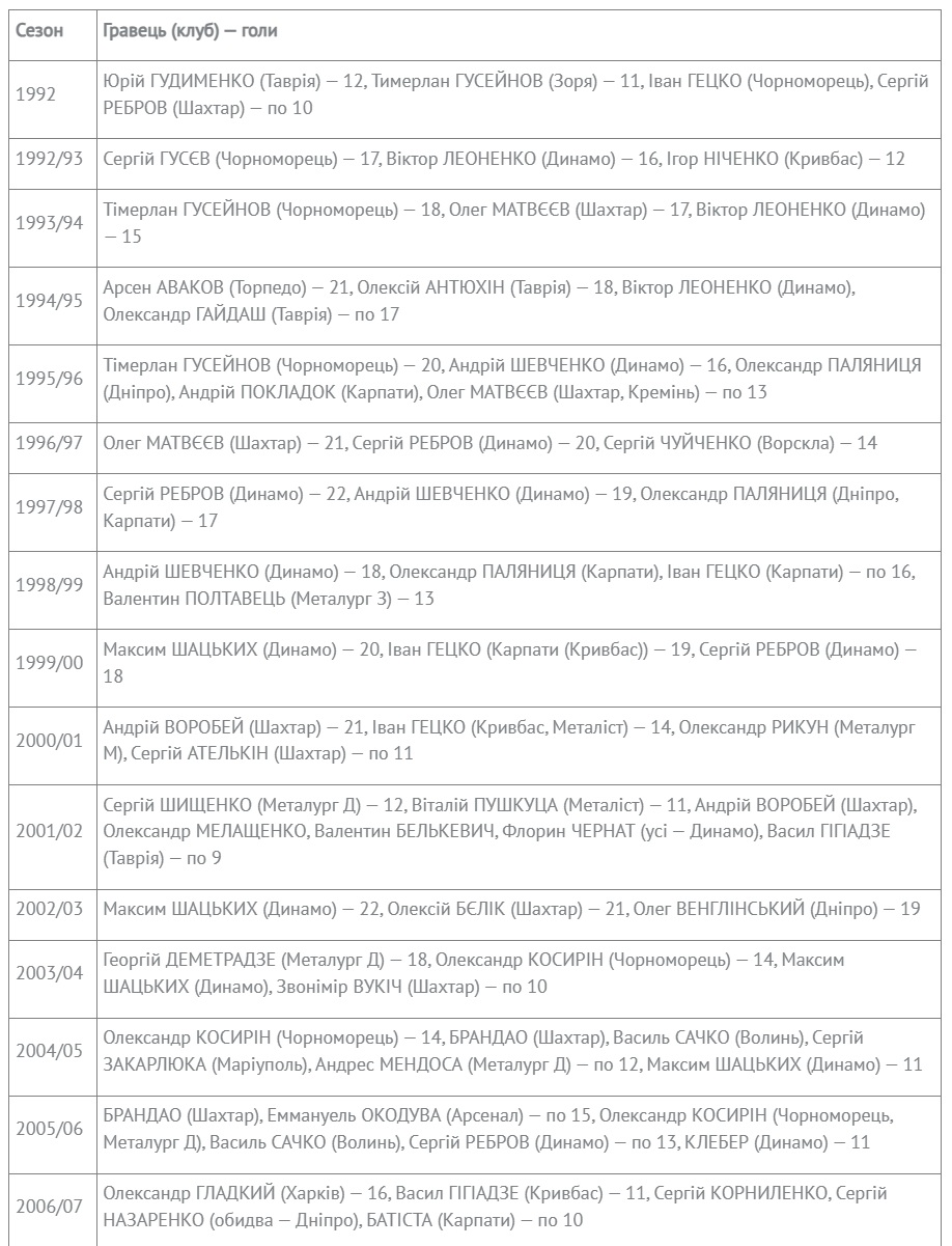 In total, throughout the history of the Ukrainian Championship, 30 players have won the title of top scorer of the season.