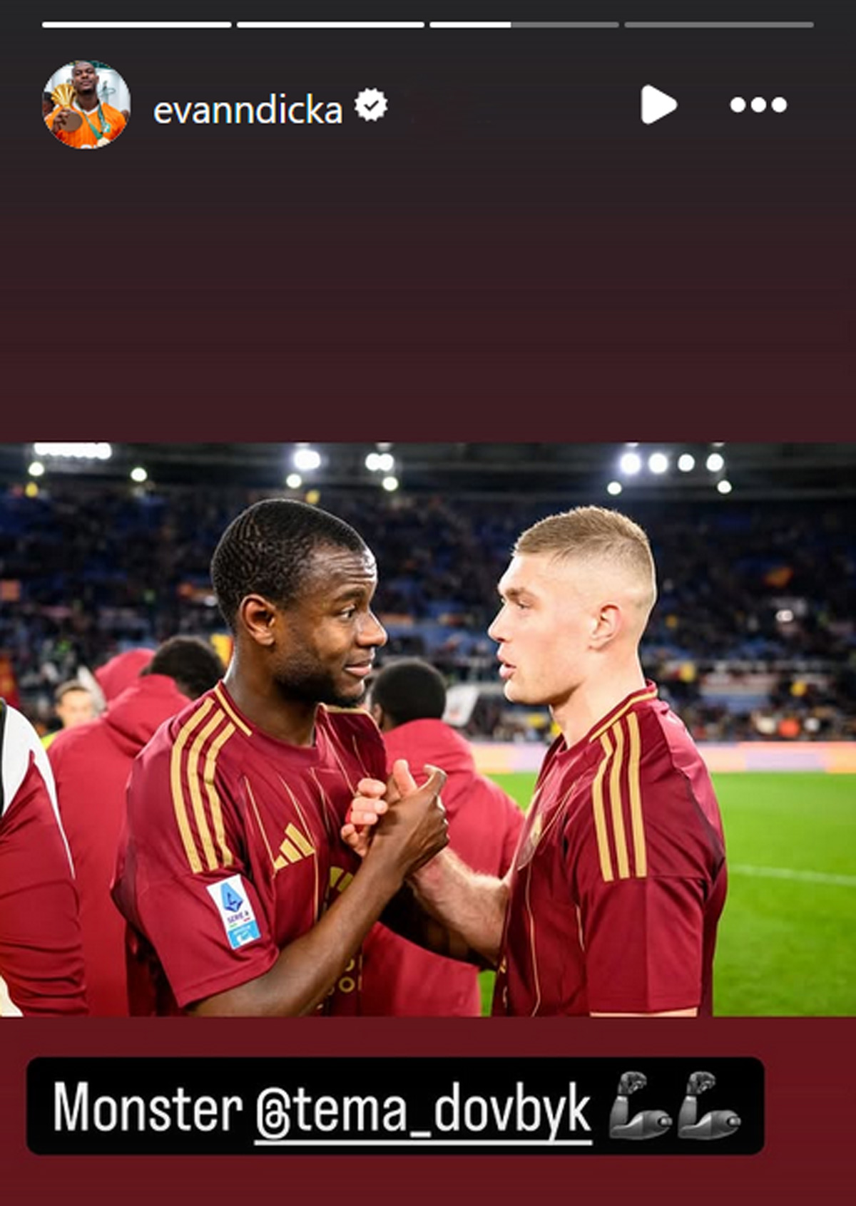 Обит Эван Ндика«Монстр», — написал Ндика на своей странице в социальной сети Instagram, прикрепив вышеприведенное фото с Довбиком (и отметил его) после недавнего матча чемпионата Италии с «Комо» (2:1), в котором украинец стал автором победного гола «Ромы».