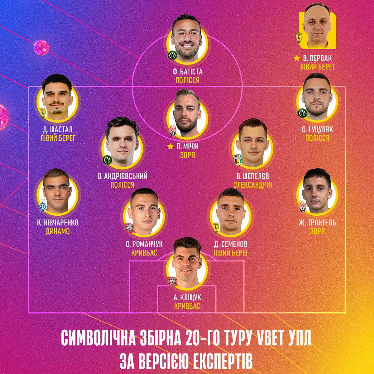 Сборная же 20-тура приобрела такой вид: Клищук («Кривбасс») — Тронтель («Заря»), Семенов («Левый Берег»), Романчук («Кривбасс»), Вивчаренко («Динамо») — Шепелев («Александрия»), Андриевский («Полесье»), Мичин («Заря») — Гуцуляк («Полесье»), Шастал («Левый Берег»), Батиста («Полесье»).