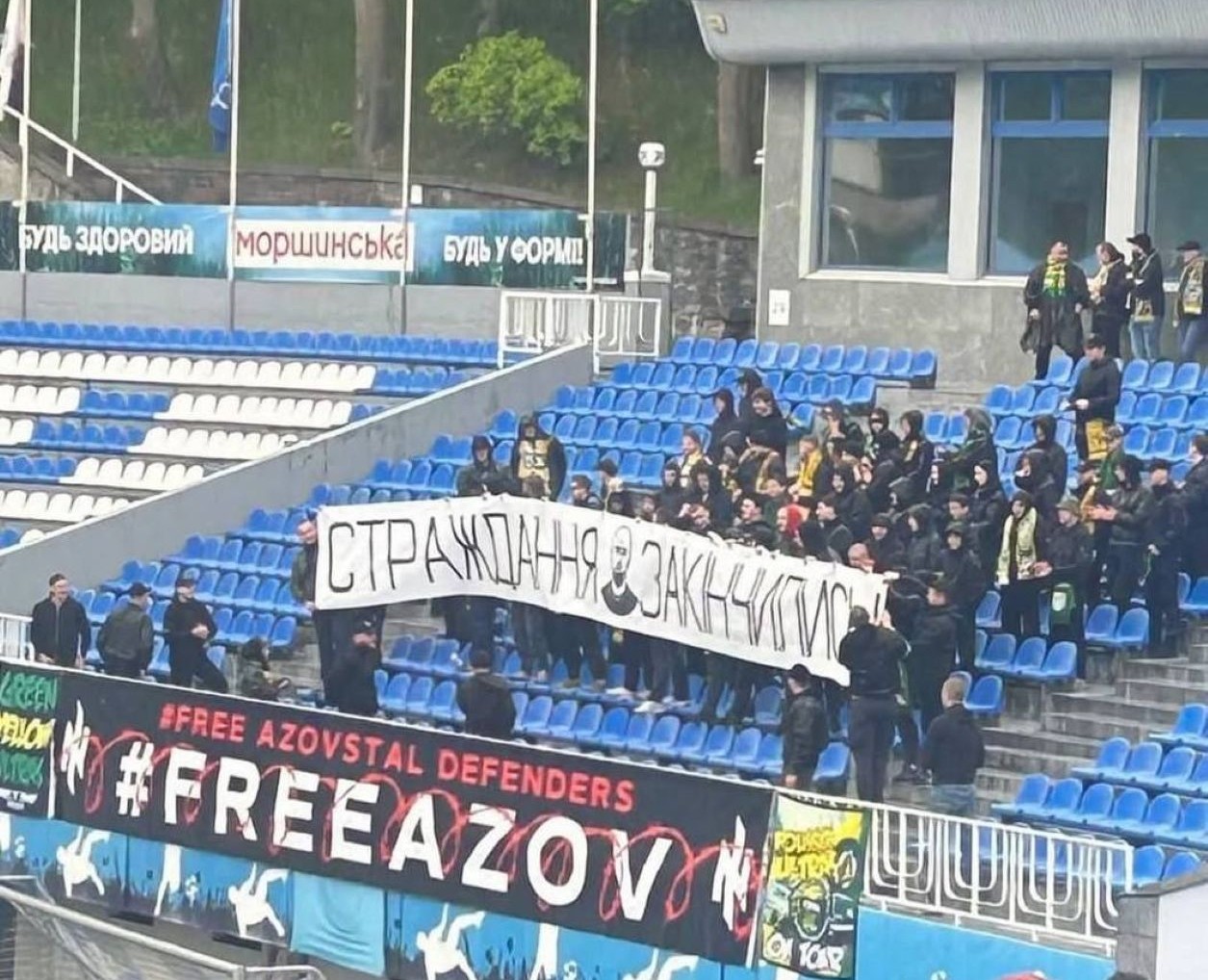 Фото: Заря ЛондонскаВо время сегодняшнего матча чемпионата Украины против «Зари», болельщики житомирского клуба вывесили специальный баннер, на котором было написано: «Страдания закончились».