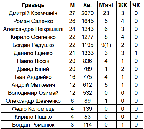 * в графе «Голы» в скобках обозначено количество голов с пенальти; ЖК — предупреждение; ЧК — удаление