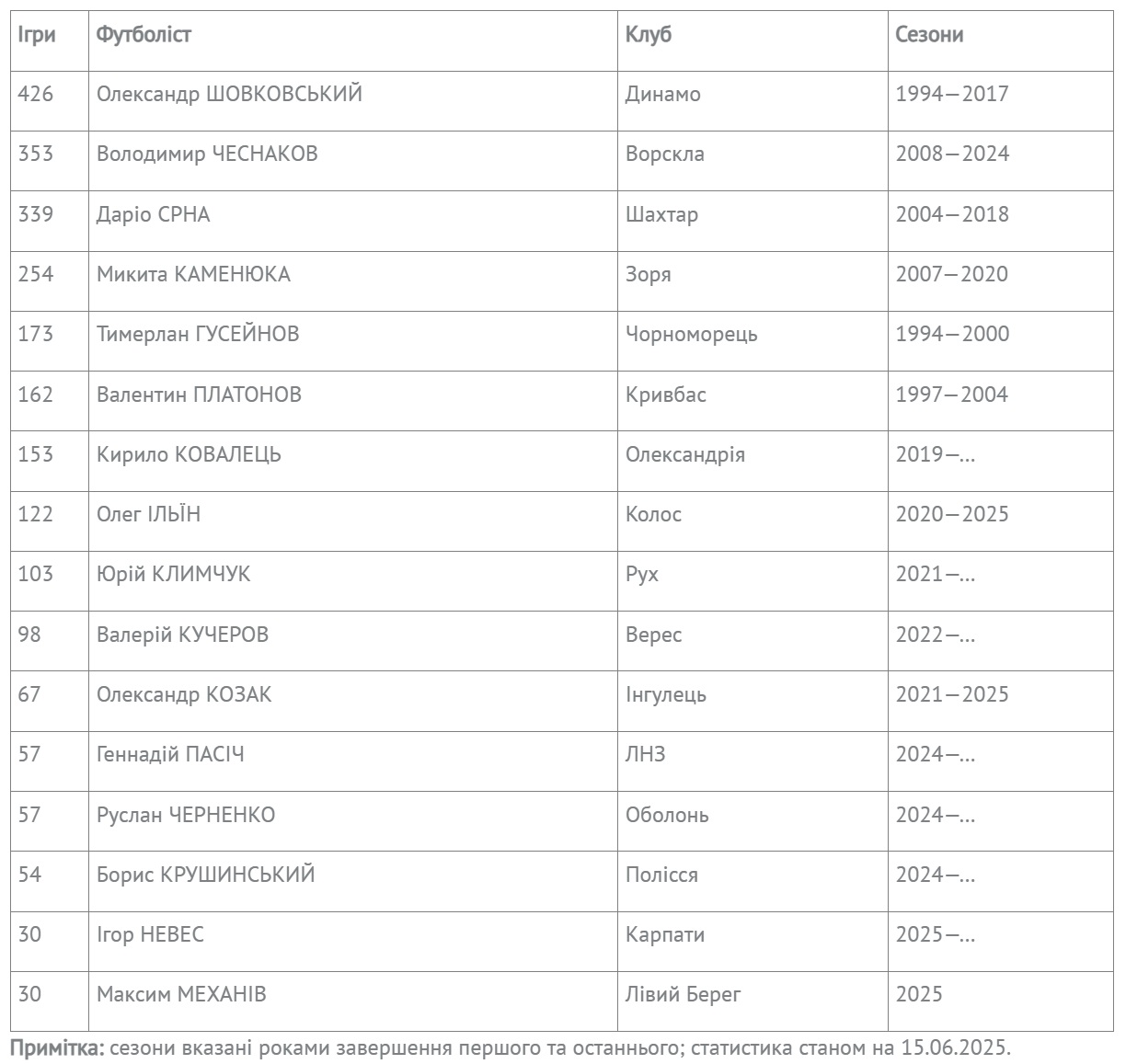 Рекордсмены участников сезона 2024/25 по количеству игр в чемпионате Украины