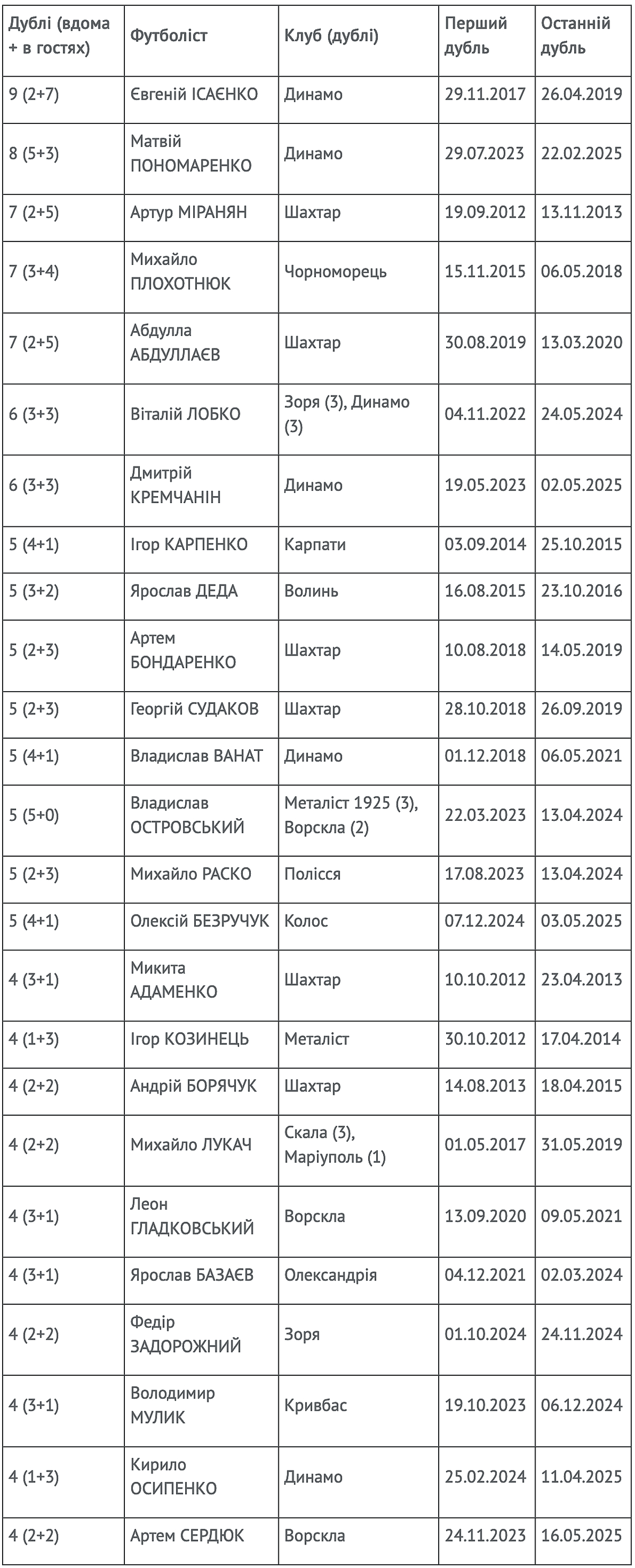 В исторический рейтинг лучших дуплетистов попали также: Дмитрий Кремчанин («Динамо»), который оформил 6 дублей, Алексей Безручук («Колос») — 5, Федор Задорожный («Заря»), Владимир Мулык («Кривбасс»), Кирилл Осипенко («Динамо») и Артем Сердюк («Ворскла») — по 4.